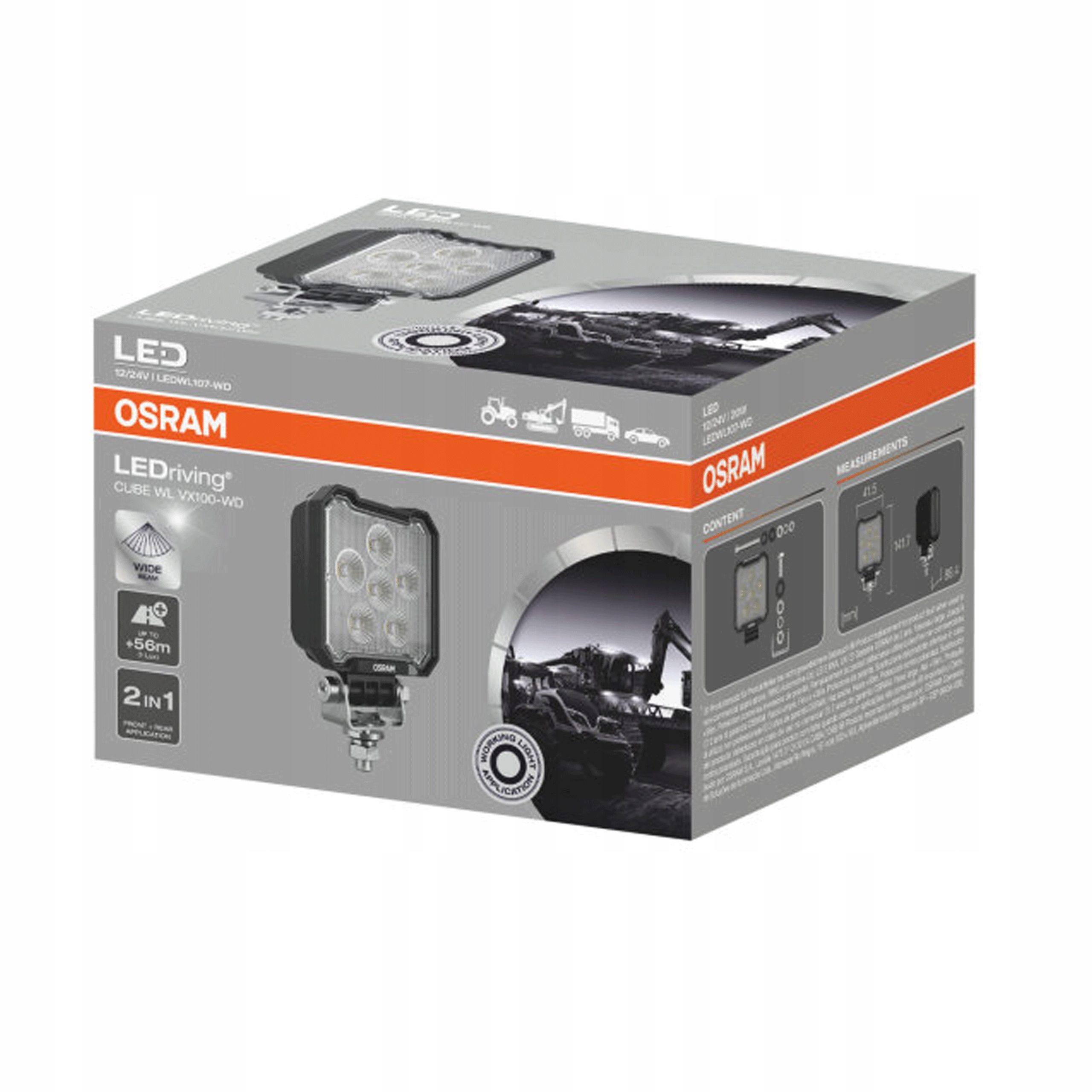 Крім того, робоча лампа має схвалення відповідно до ECE R148 як зворотне світло. Ledriving Cube WL VX100-WD було протестовано та затверджено для класів захисту IP6K8 та IP6K9K у нашій лабораторії DI-моделювання для надзвичайних зовнішніх впливів, таких як вода, пил, удари, тепло, холод та постійні вібрації. Це ефективне та ефективне доповнення до вашого транспортного засобу і може бути прикріплений до вантажних автомобілів, сільськогосподарських машин, комерційних транспортних засобів, будівельних транспортних засобів та транспортних засобів бездоріжжя