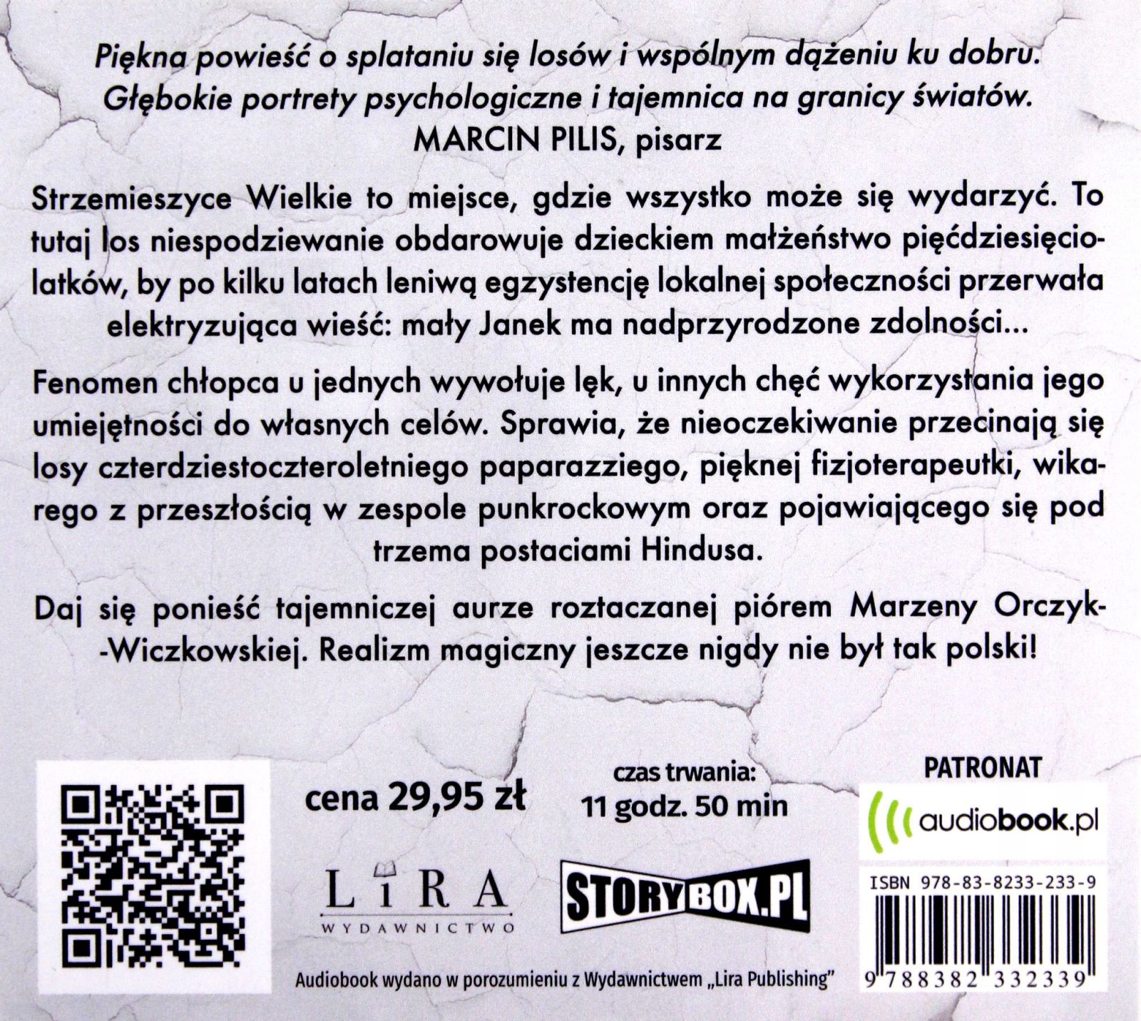 «Прекрасний роман про переплетіння доль і спільне прагнення добра. Глибокі психологічні портрети і таємниця на межі світів». МАРСІН ПІЛІС, письменник. Стшемешиці Велкі – це місце, де може статися все. Саме тут доля несподівано дарує п’ятдесятилітньому подружжю дитину, але через кілька років ліниве існування місцевої громади перериває приголомшлива новина: маленький Янек володіє надприродними здібностями... Феномен хлопчика декого викликає страх. , а в інших бажання використовувати його здібності в своїх цілях. У ньому несподівано перетинаються долі сорокачотирирічного папараці, красуні-фізіотерапевта, священика з минулим у панк-рок-групі та індійця, який постає у трьох іпостасях. Дозвольте собі захопитися таємничою аурою, яку поширює перо Маржени Орчик-Вічковської. Магічний реалізм ніколи не був таким польським!