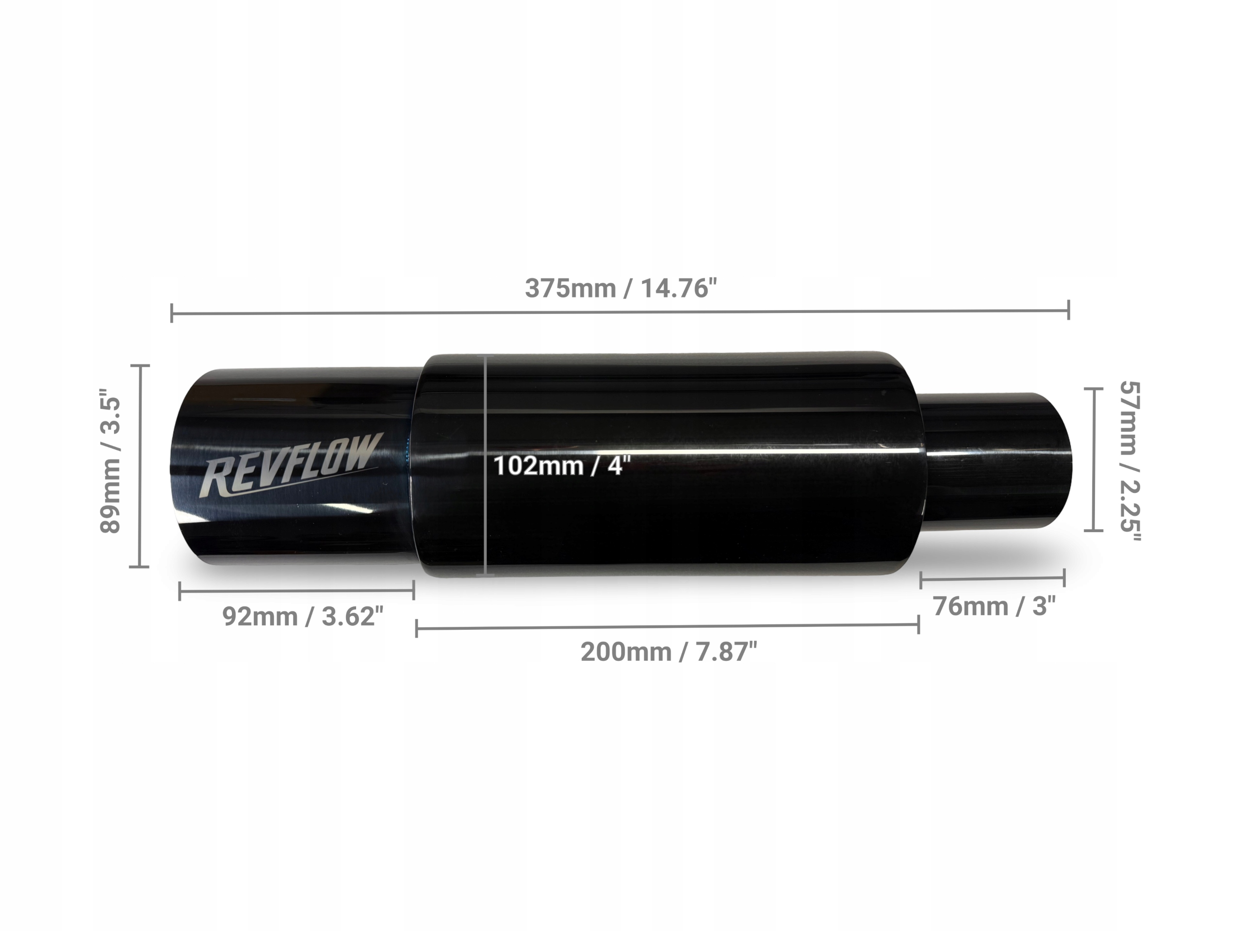 revflow кінець муффера - це суцільна пропозиція для людей, які змінюють вихлопну систему свого автомобіля. Виготовлений з нержавіючої сталі , відрізняється довговічністю, стійкістю до високих температур та корозії, а також естетичною обробкою кольору титанового чорного .