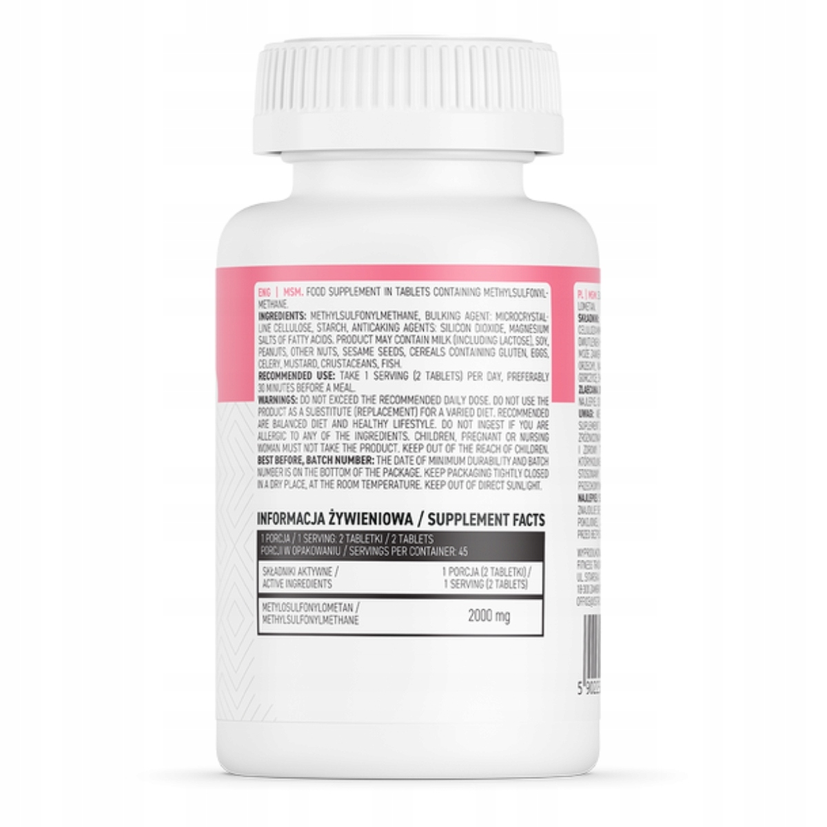 інгредієнти : метилосульфонілометан, наповнююча речовина: мікрокристалічна целюлоза; Крохмаль, антибереження: кремній діоксид, солі магнію жирних кислот.