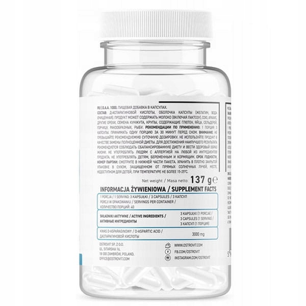 - Аспаркова кислота - це Органічна хімічна сполука, з групи ендогенних амінокислот білка. Він бере участь у біосинтезі багатьох сполук в нашому організмі, а також є одним із продуктів циклу лимонної кислоти, широко відомого як цикл Кребса та глюконеогенез (біосинтез глюкози). Аспаркова кислота - це активна сполука в самому центрі мозку. Викликає вивільнення FSH (foliclotropic), LH (лютропін) або гормону росту. Він також може накопичуватися в яєчках, де він заспокоює обмеження швидкості синтезу тестостерону, що призводить до збільшення його виробництва. Як використовувати: 1 порція: 3 капсули. Споживайте одну порцію за 30 хвилин до сну. Не перевищуйте рекомендовану щоденну порцію для споживання. Дієтична добавка не може бути використана як замінник (заміна) різноманітної дієти. Рекомендується збалансована дієта та здоровий спосіб життя. Не споживайте у випадку алергії на будь -який з інгредієнтів продукту. Продукт не повинен користуватися дітьми, вагітними та годувальними матерями. Зберігайте недоступно до маленьких дітей. Якість підтверджена лабораторія охорони здоров'я, продукти Ostrovit проходять регулярні дослідження в незалежній акредитованій лабораторії, щоб забезпечити та підтримувати найвищу якість.