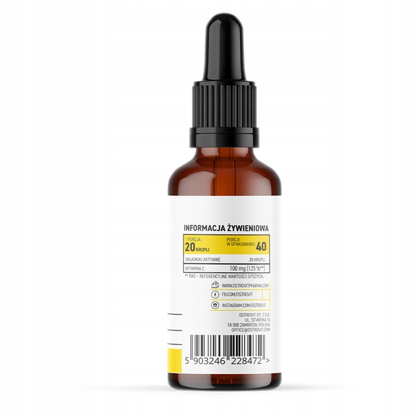Одна пляшка ОстроВіт Фарма Вітамін С містить 40 добових порцій L-кислота аскорбінова кислота в рідкій формі, що добре всмоктується. Дієтична добавка створена в першу чергу для людей, які відчувають дискомфорт при ковтанні вітамінів у таблетках або капсулах і шукають продукт, багатий вітаміном С, зручний у дозуванні та споживанні.