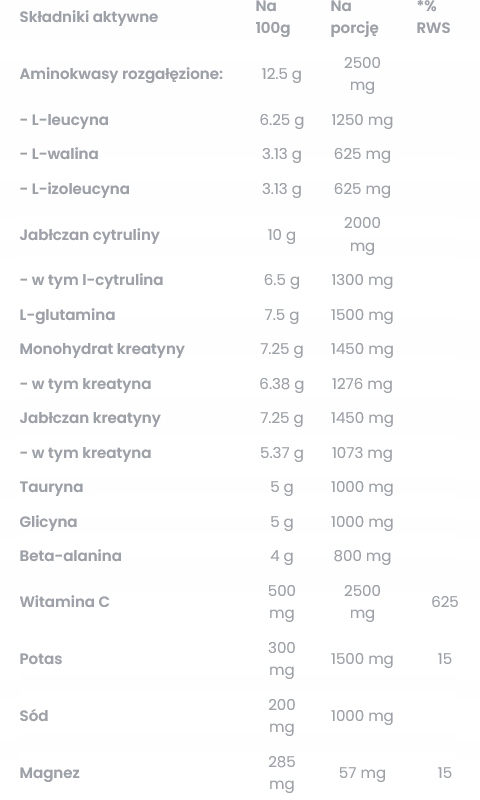 Мальтодекстрин, розгалужені амінокислоти BCAA (l-лейцин, l-валін, l-ізолейцин), цитрулін малат, L-глутамін, креатин моногідрат, трикреатин малат, таурин, гліцин , цитрат калію (калій), бета-аланін, L-аскорбінова кислота (вітамін С), хлорид натрію (натрій), ароматизатор, магнієві солі лимонної кислоти - цитрат магнію (магній), регулятор кислотності: лимонна кислота; порошок концентрат соку бурякового, підсолоджувач: сукралоза; барвник: каротини; підсолоджувач: ацесульфам К.