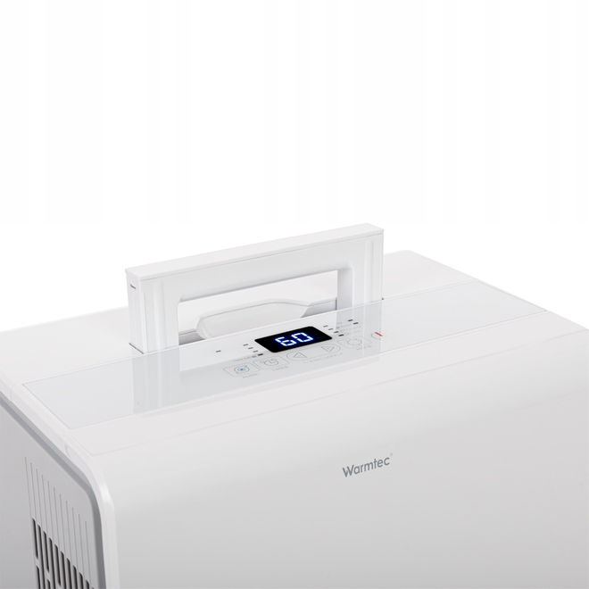 У верхній частині пристрою є інтуїтивно зрозуміла панель керування з цифровим дисплеєм. Кнопки на панелі зрозумілі і великі, що робить управління пристроєм надзвичайно простим. Поточний рівень вологості в кімнаті можна легко прочитати на дисплеї. Крім того, на панелі управління є іконки, які інформують про активований таймер, режим вентилятора, повний резервуар для води та режим безперервної сушки.