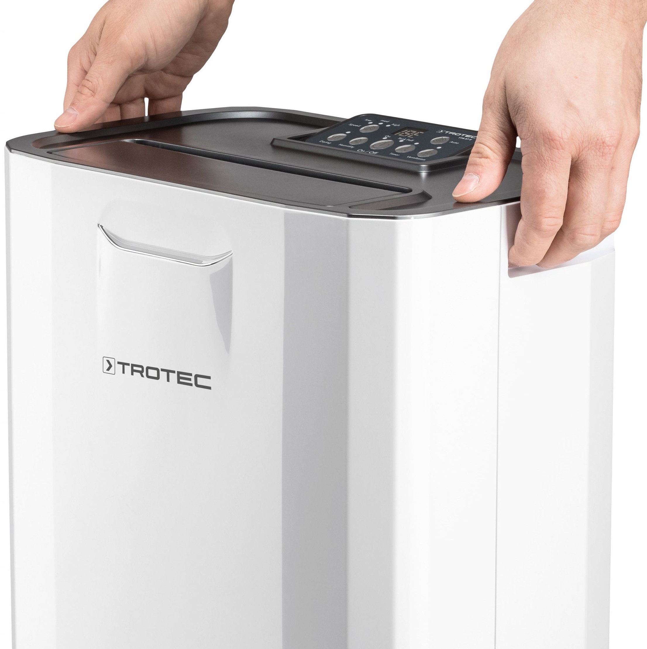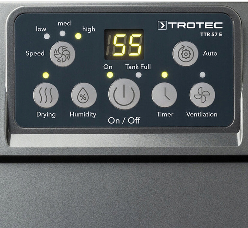 Осушувач повітря Trotec TTR 57 E вирізняється елегантним дизайном і підійде для будь-якої кімнати. Модель TTR 57 E оснащена багатьма корисними функціями, такими як: функція сушіння з гігростатичним контролем, таймер, встановлення цільових значень вологості повітря, функція сушіння білизни та можливість безперервної роботи. Важливим елементом цієї моделі є вбудований повітряний фільтр і фільтр з активованого вугілля для додаткового очищення повітря шляхом уловлювання пилу або волосся. Ємність для води має ємність 5 літрів і має датчик наповнення з автоматичним відключенням, а коли резервуар порожній, робота автоматично відновлюється. Пристрій також має підключення для зовнішнього відведення конденсату.
