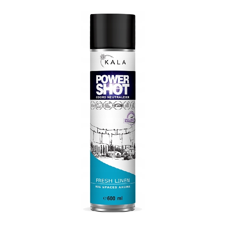 Нейтралізатор неприємних запахів Kala POWER SHOT освіжувач повітря ззапахами FRESH LINEN (свіжа білизна) (600 мл) - це запах бездоганної чистоти, білизни, щойно вивішеної сушитися на сонячній галявині. Він буде ідеальним скрізь, де ми хочемо підкреслити та підвищити чистоту та гігієну.