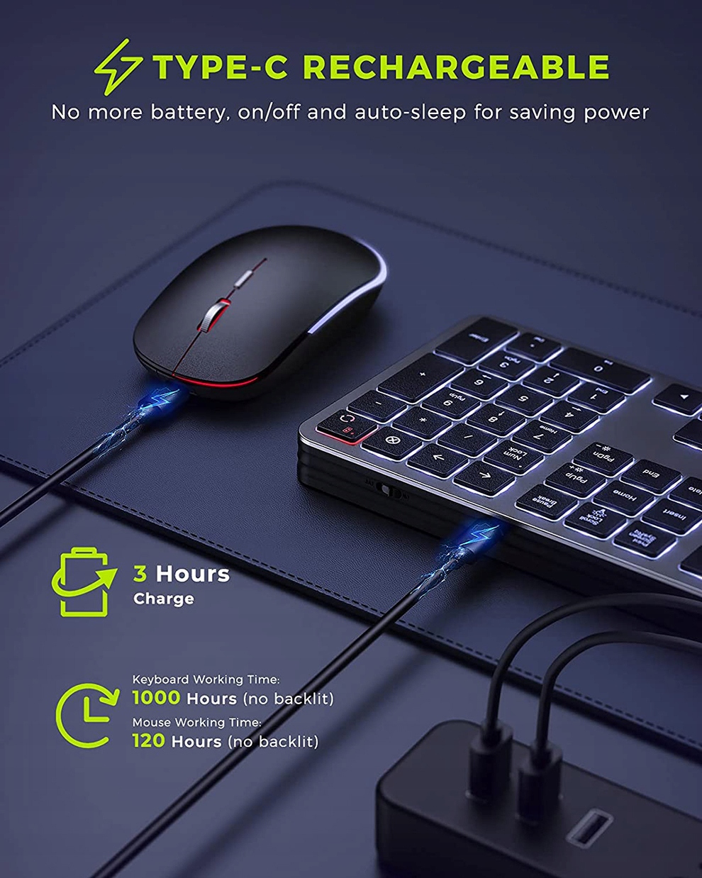 Клавіатура та миша з можливістю зарядки як клавіатури, а мишу можна легко зарядити за допомогою включеного кабелю USB C. На відміну від інших завантажуваних клавіатур, доступних на ринку, які мають лише 200 мАг або 300 мАг, клавіатура комп'ютера Senda оснащена вбудованою акумулятором сміття 2000 мАг, яка підтримує до 1-2 місяців (виходячи з щоденного використання) (на основі щоденного використання) робочого часу без підсвічування. (Режим підсвічування відрізняється від яскравості, PLS підлягає реальному використанню!) Ніколи більше батарейних батарей, живіть із зеленим життям!