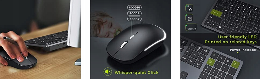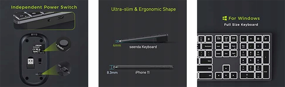 Мовчазний як шепіт з низьким рівнем клавіатури та миші -бездротова клавіатура Senda була розроблена за допомогою вдосконалених, низькопрофільних тихих клавіш із ножичним перемикачем, а елегантний, впорядкований, елегантний та компактний дизайн клавіатури дозволяє насолоджуватися комфортним та плавним написанням та натисканням. Мовчазна кнопка і точна миша. Більше не натискає! Тихе натискання клавіш миші показує вашу любов та турботу про навколишнє середовище, особливо в бібліотеці, кафе чи пізній роботі вночі