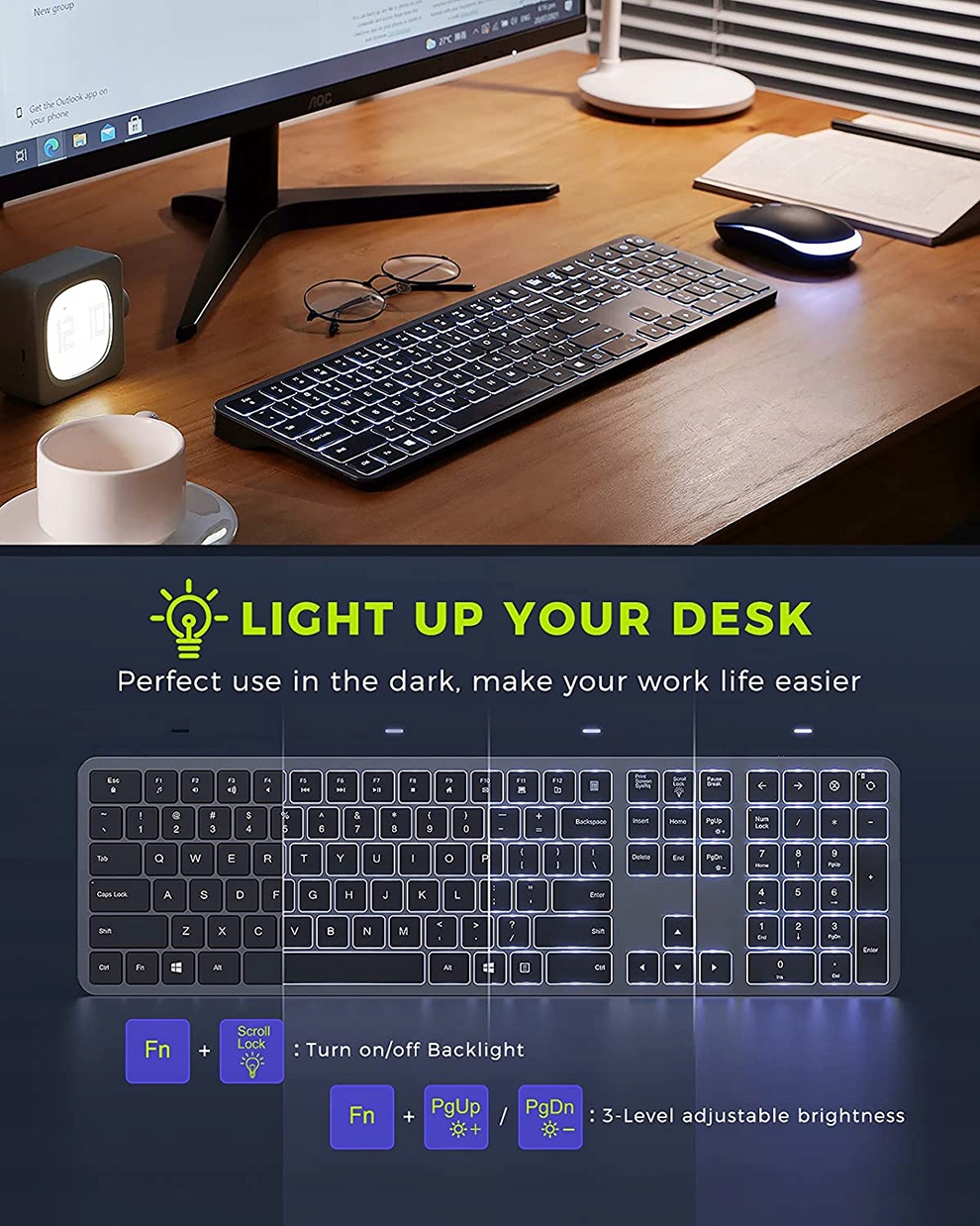 Освітлена бездротова клавіатура та миша - біла підсвічування яскрава і рівномірно розміщена, без відбивачів, менше світла, ніж у випадку кольорової підсвітки, захищає очі та зручніше написання в умовах поганого освітлення. Ідеально підходить для роботи в студії, офісі та будинку. Регульована яскравість на 3 рівні: низькосмій-Візока для задоволення всіх ваших потреб. Інтелектуальна функція автоматичного сну та перемикач/перемикач на обох пристроях - це чудове доповнення до продовження часу акумулятора