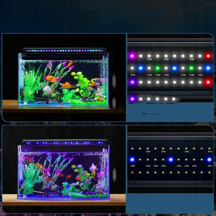 - Два режими освітлення: білий + синій і лише синій, білі + сині світлодіоди для денного світла та сині світлодіоди для нічного освітлення. Ідеально підходить для риб, медуз, водних рослин. Світлодіодне освітлення в акваріумі наближене до природного, безпечніше, не може завдати шкоди ні людям, ні рибам.
