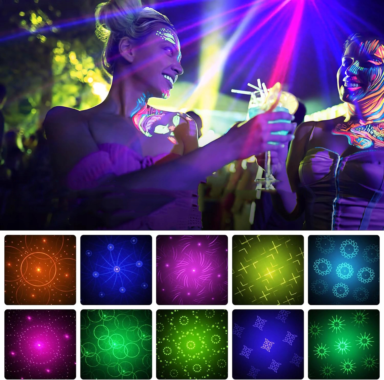 🎉🎉【Потужні мультиефекти】 Нові вдосконалені лазерні ліхтарі для вечірок, здатні генерувати 60 комбінацій зображень, 6 кольорів фону (червоний, зелений, синій, червоний і зелений, червоний і синій, синій і зелений) і 3 комбінації променів (зелений, червоний, зелений і червоний), створюючи чудову сценічну атмосферу завдяки поєднанню багатьох ефектів і високоякісної проекції.