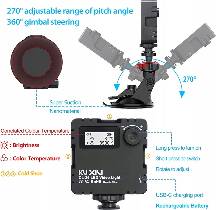 Спеціальна присоска з наноматеріалів може бути у вакуумному стані, тож безперервне освітлення можна міцно прикріпити до задньої панелі ноутбука чи планшета. Знімаючи присоску, спочатку відкрийте всмоктувальний клапан, потім обережно підніміть всмоктувальний конус і повільно відірвіть його.
