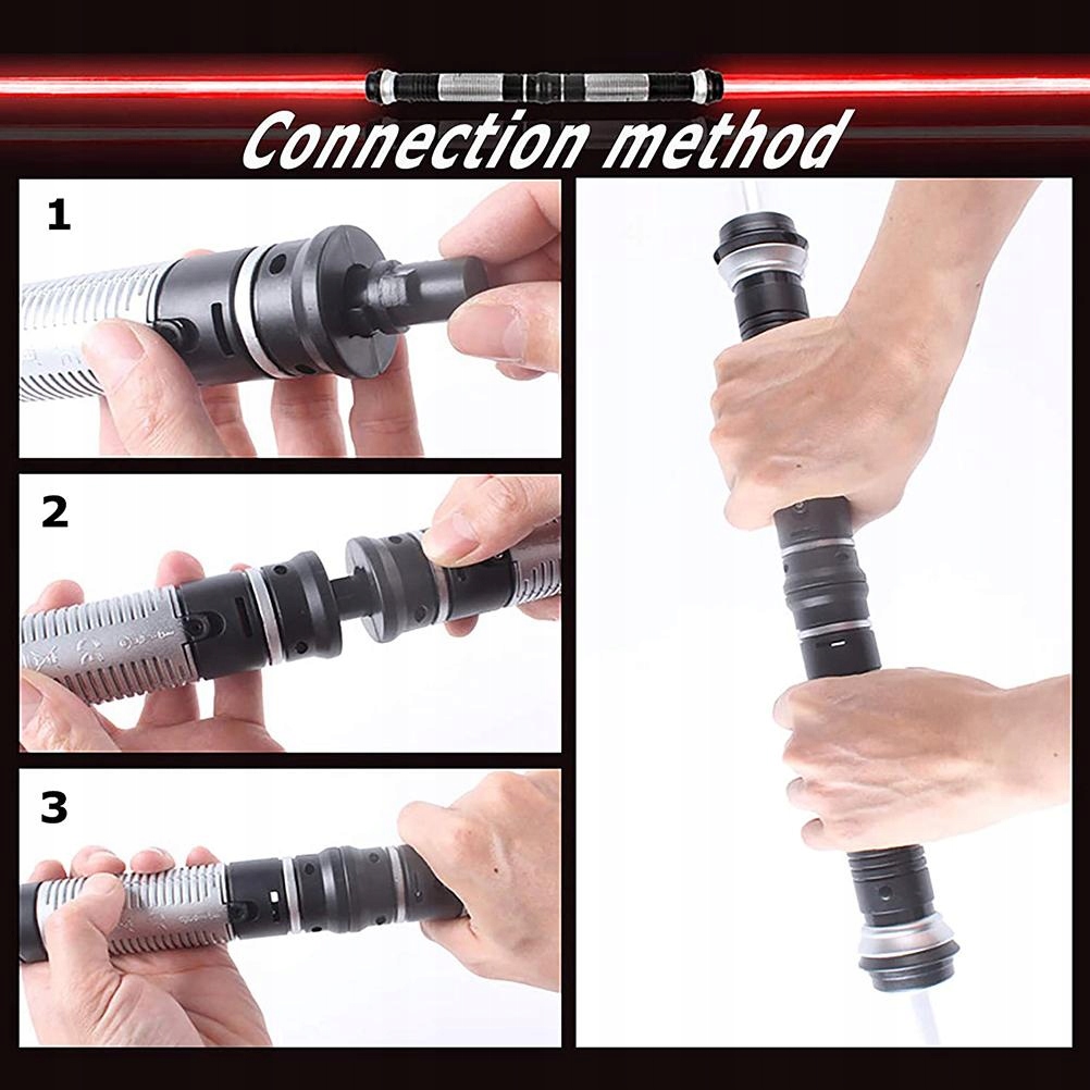 1. 1. Світлодіодний меч «два в одному»: 2 висувні світлові мечі (довжина від 16,9 дюймів до 32,6 дюймів) зі зручними ручками. Два світлові мечі можна з’єднати за допомогою роз’єму, щоб створити довший світловий меч.