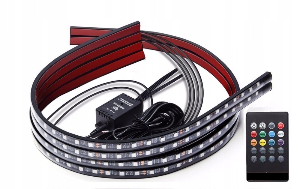 Чотири смужки керуються за допомогою бездротового пульта дистанційного керування. Планки гнучкі, що полегшує установку під шасі автомобіля. Їх також можна встановити в багажнику, на дверях багажника, під решіткою тощо. Вони виготовлені з ПВХ матеріалу з двостороннім скотчем для легкої установки.