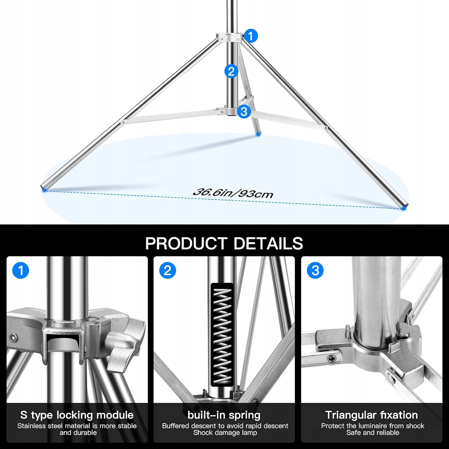 Ви можете вільно регулювати висоту підставки для освітлення від 39 дюйм/99 см до 110 дюймів/280 см; Його міцні можливості блокування забезпечують безпеку вашого освітлювального обладнання під час використання. А підставку для світла можна скласти, мінімальна висота в складеному вигляді становить 37 дюймів/94 см. Вага становить лише 2,46 кг/5,42 фунта, що дуже зручно носити будь-куди.