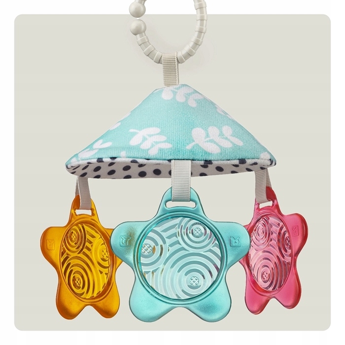 - підтримує розвиток: Це всебічно стимулює око (включаючи візуальне сприйняття ), слух, дотик, розвиває невеликі рухові навички (захоплення, маніпуляції) та високі (зміцнення м’язів шиї, рухова координація), координація руки, самосвідомість та когнітивна здатність.