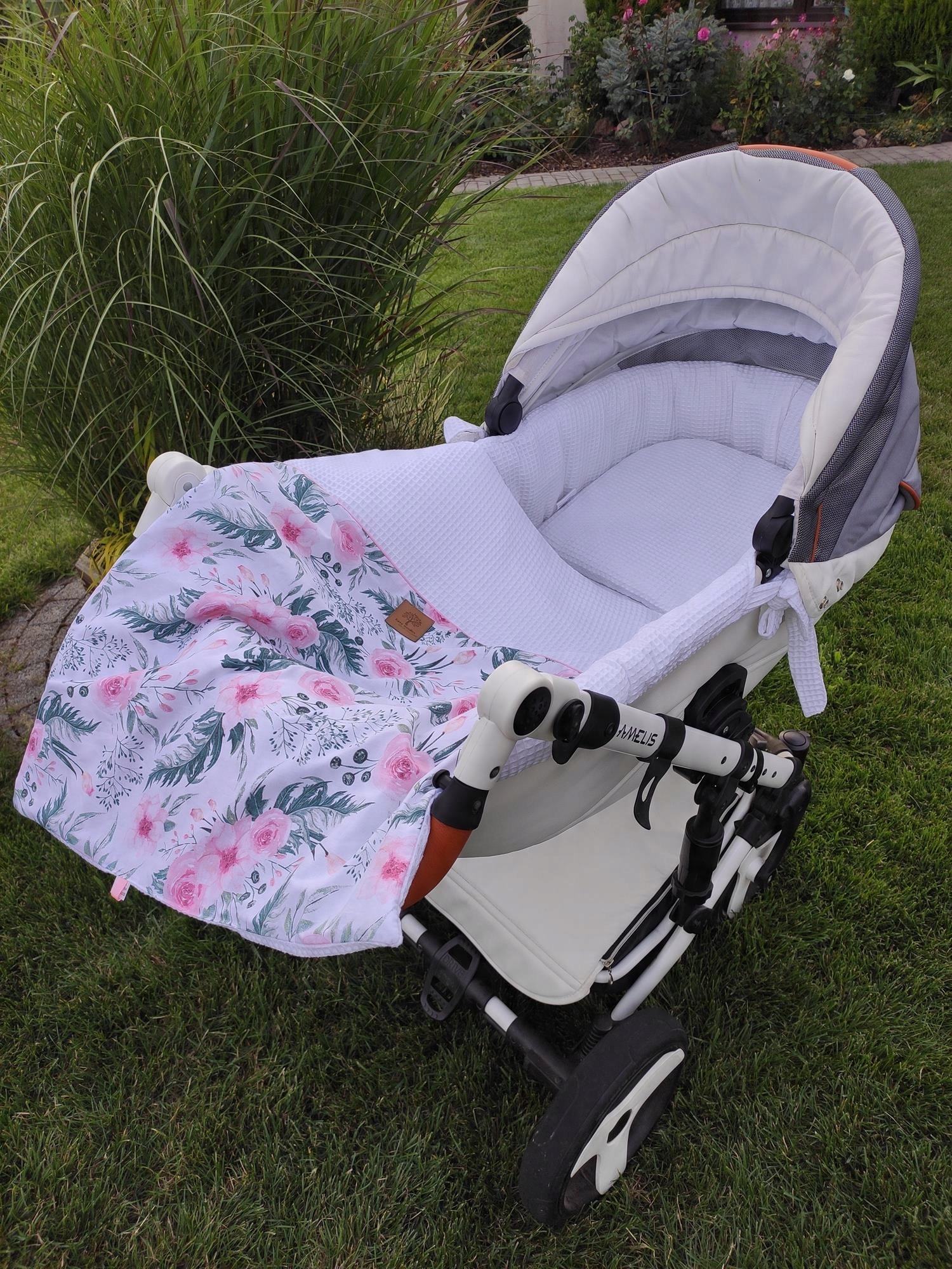 - Універсальний вкладиш підходить для більшості дитячих колясок. Ви можете затягнути все, як забажаєте, за допомогою вшитих ременів, які створюють декоративні дуги з обох боків коляски.