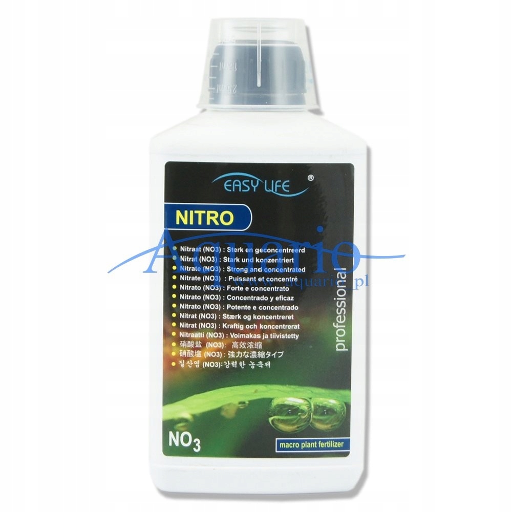 Нітро — це концентроване азотне добриво (NO3) з додаванням калію (К). Незамінний у кожному рослинному резервуарі. Завдяки цьому кондиціонеру рослини ростуть швидше, не втрачають старе листя, не «тягнуться» до світла, а, головне, виглядають здоровими та красивими. Це дуже стійке добриво без фосфатів. Рекомендований рівень нітратів NO3 у воді становить 10-20 ppm.