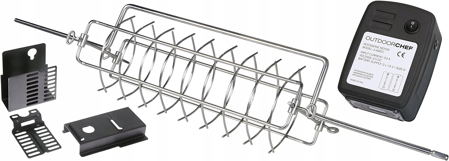 На вертелі Outdoorchef м'ясо поміщається в спеціальний затиснутий обертовий кошик, а не на шампур, завдяки чому сік залишиться в м'ясі. Ідеально підходить для печені та інших великих шматків м’яса. Вертел працює від електродвигуна та двох батарей D (не входять у комплект).