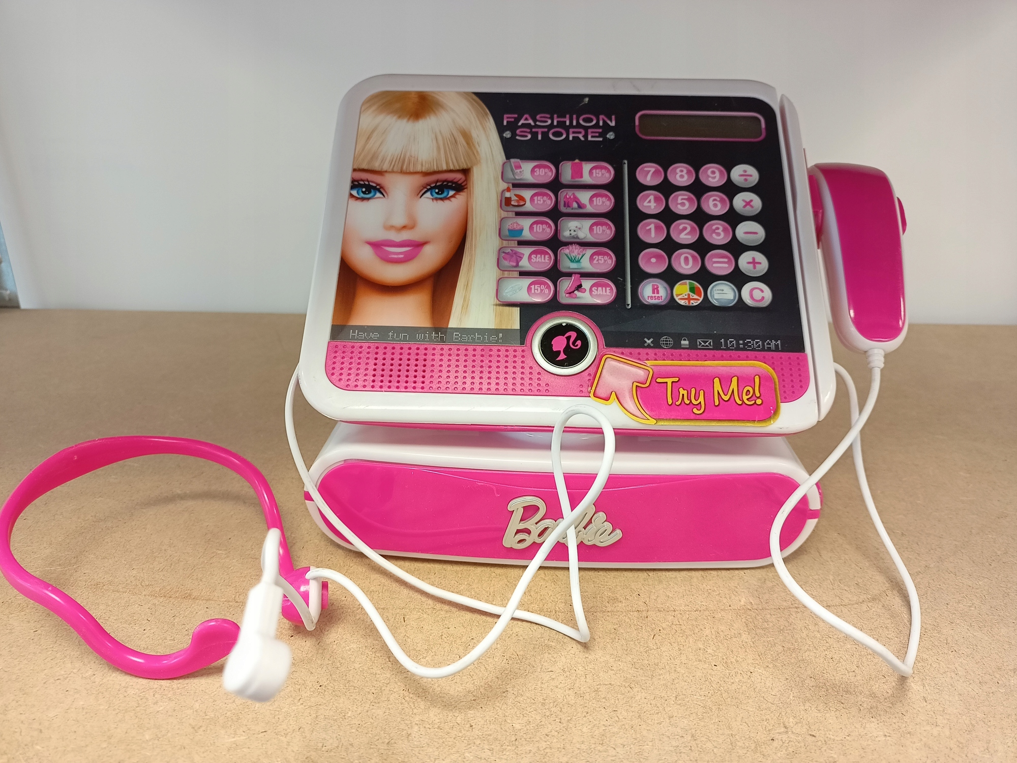 Barbie Cash Register, виробництва Intek, - красивий касовий апарат для бутіка - магазину з продажу модного жіночого одягу. Ця інтерактивна іграшка створена в чарівному стилі Барбі, тому неодмінно порадує кожну дівчинку. Касовий апарат Barbie додатково оснащений сканером штрих-кодів, мікрофоном, зчитувачем кредитних карток, справжнім калькулятором і 52 аксесуарами (включаючи монети, банкноти, кредитні картки), що дозволяє весело провести час у магазині наймоднішого одягу. меню реєстрації має десять розділів розпродажів, тому можна врахувати знижки. Цей надзвичайно дівчачий рожевий касовий апарат магазину має три мовні версії (англійську, іспанську та португальську), що робить його ідеальною навчальною іграшкою, яка допомагає вивчати іноземні мови та водночас дуже весело.