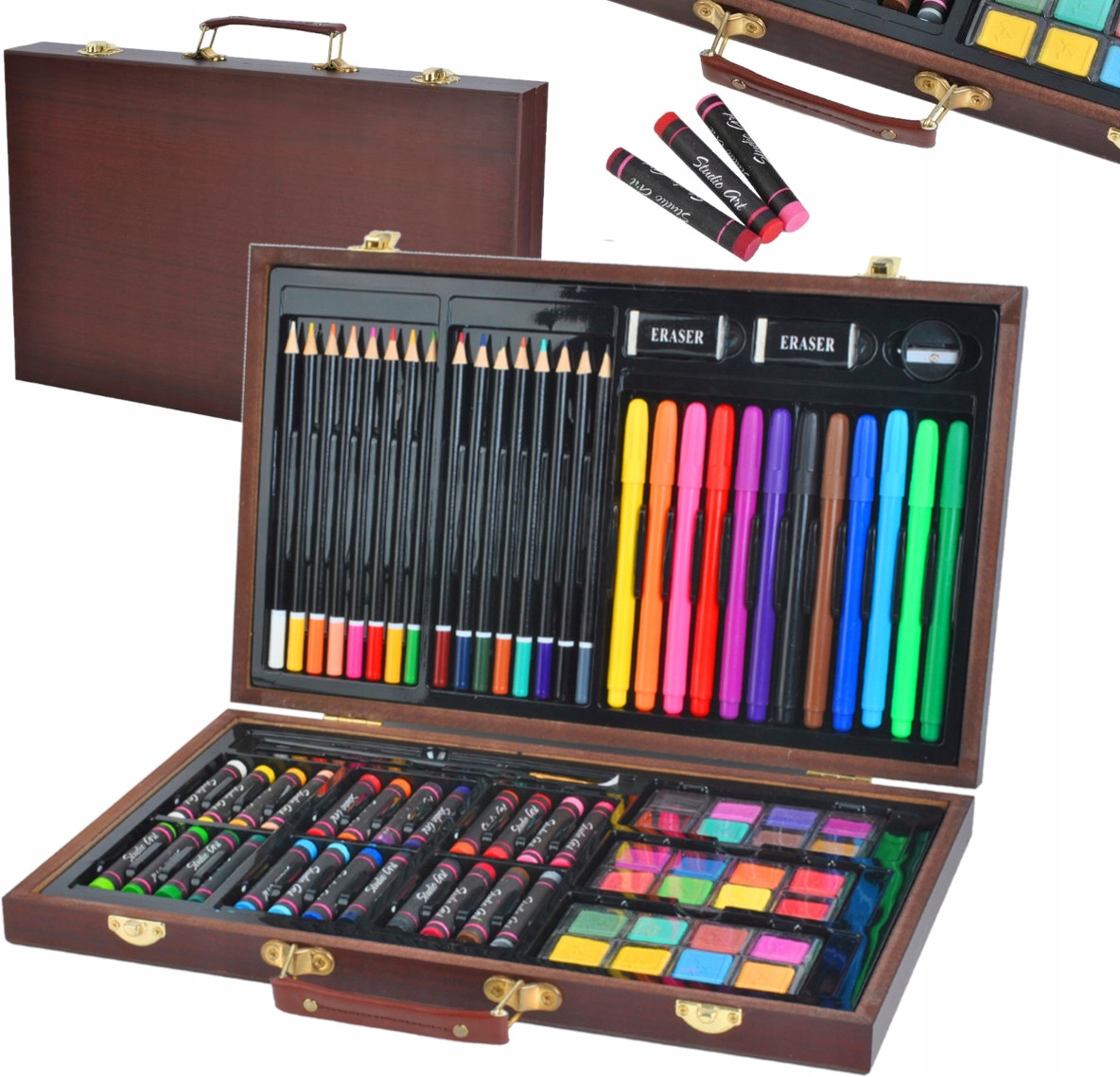 81 ЕЛЕМЕНТ – З цією добіркою ваша дитина легко створить найфантазніші, креативні та оригінальні художні роботи! Крім того, все знаходиться в одній великій дерев'яній валізі, яка застібається на застібку і практичну ручку, завдяки якій ви можете легко взяти набір з собою куди завгодно!
