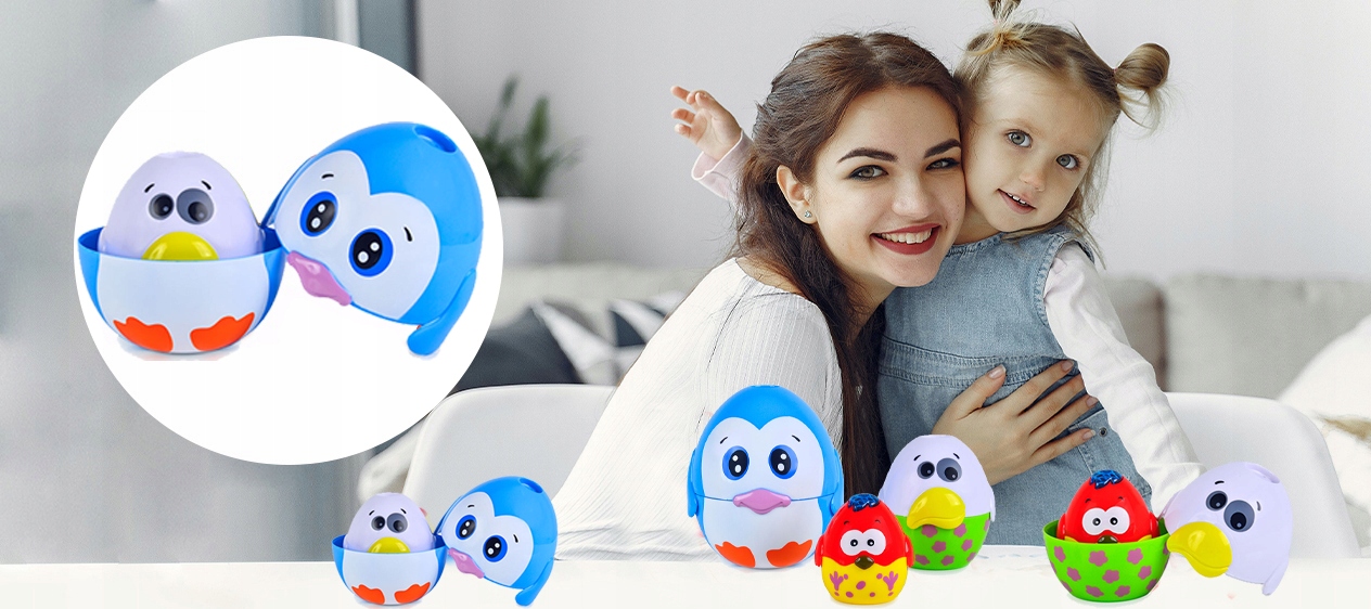 Яйця можна відкрити та покласти одне в одне або створити піраміду. Іграшка сприяє розвитку логічного мислення та координації у дитини.