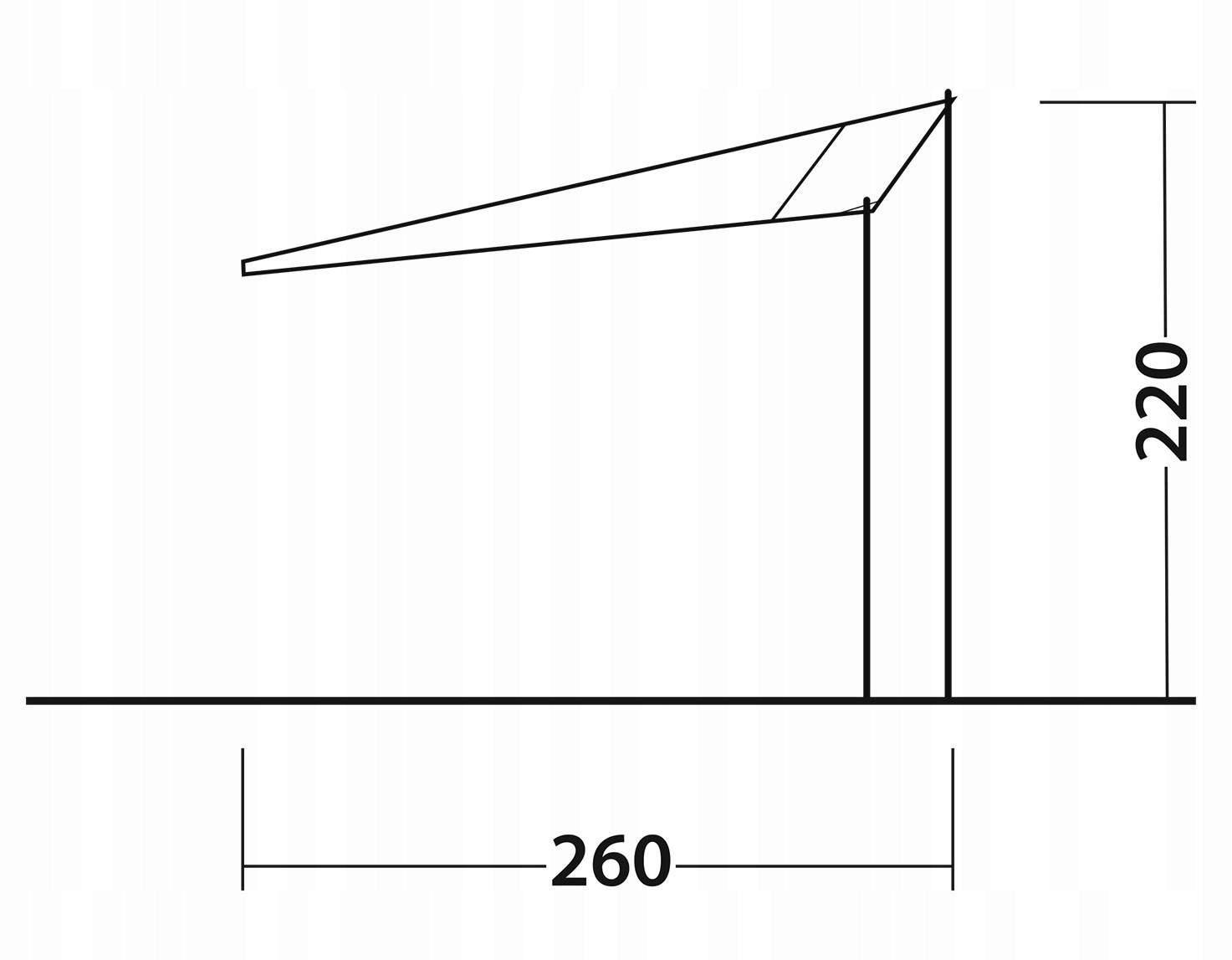 Покрівля має п’ятикутну форму. Модель підходить для позашляховиків, MPV і універсалів. Кріпити брезент можна на висоті від 155 до 280 сантиметрів. Щоб прикріпити його до даху автомобіля, ви можете використовувати як присоски, що входять в комплект, так і мотузки. Фронтальна модель базується на трьох алюмінієвих жердинах, середня має висоту 220 см, а дві бічні мають висоту 180 см. Відтяжки, що входять до комплекту, забезпечать стійкість конструкції. У набір також входять монтажні шпильки для розтяжок.
