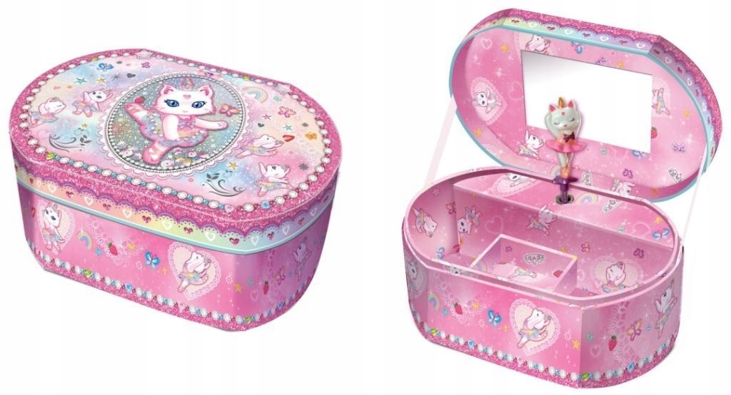 Музична скринька грає класичну мелодію. Після відкриття статуетка буде крутитися. Коли мелодія перестає грати в музичну коробку, просто знімайте. Він працює завдяки спеціальному механізму, не вимагає батарей. Він містить дзеркало і місце для приховування дрібниць. Вік: 6+