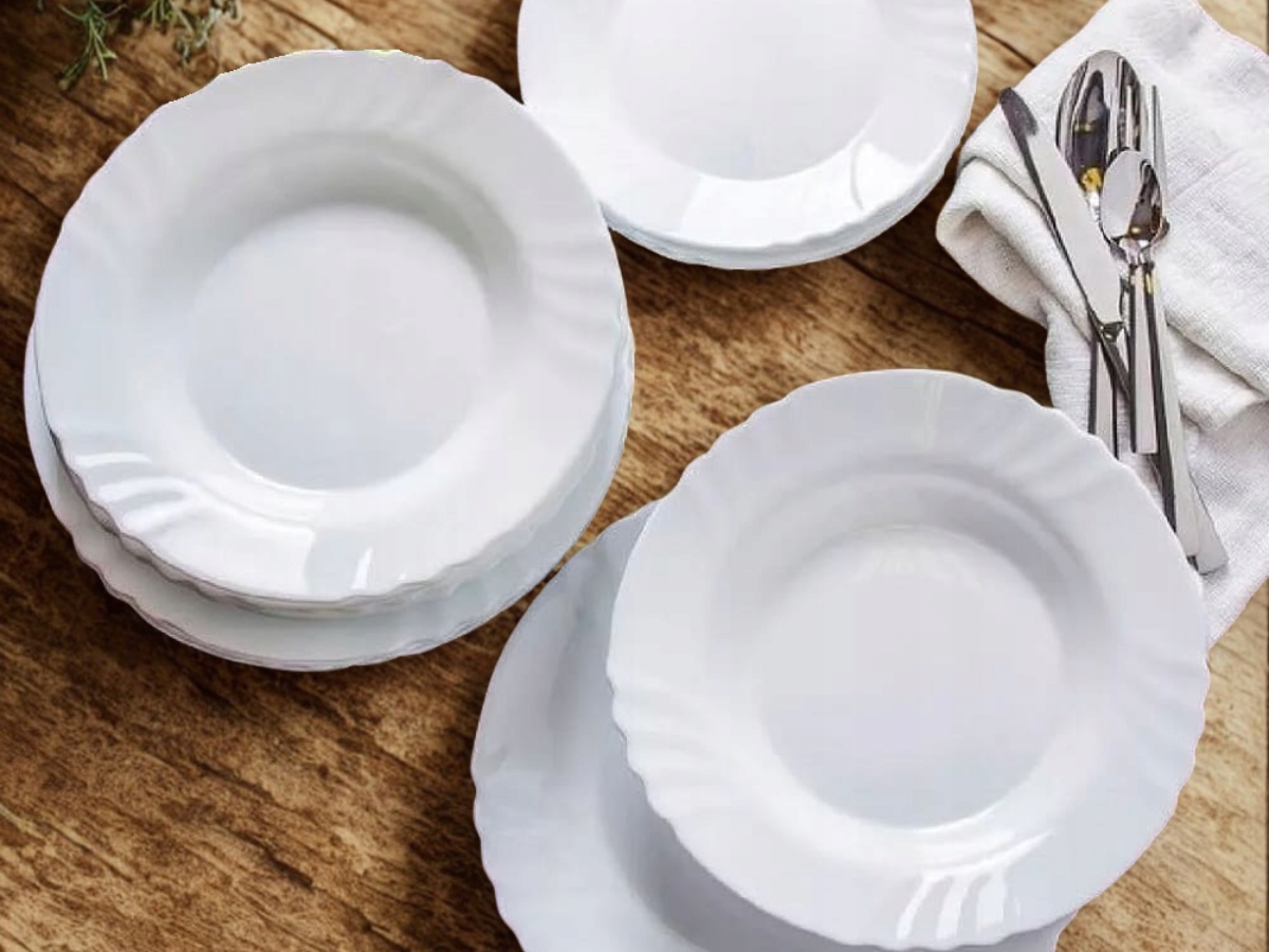 Біла блюдо з делікатною прикрасою на краях. Легкий і сильний, легкий у чистці. Домашня пластина та гастрономія.