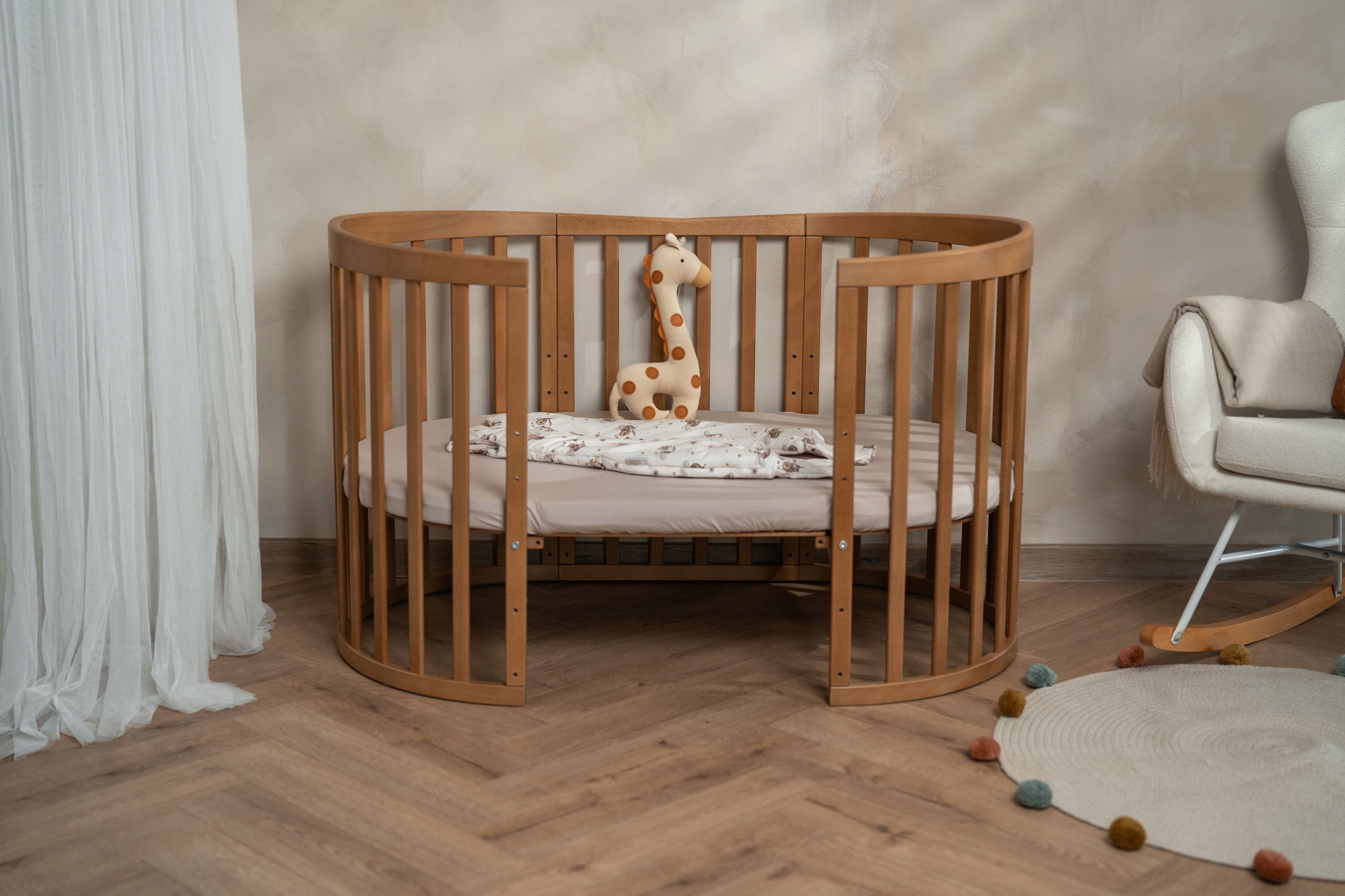 Наше овальне ліжко 7 в 1 — результат багаторічної роботи та досвіду. Виготовлена з деревини бука, яка відрізняється міцністю і водночас легкістю. Такий дитячий предмет меблів стане головною прикрасою інтер'єру і функціональним предметом обладнання. Це забезпечить вашій дитині спокійний і безпечний сон.