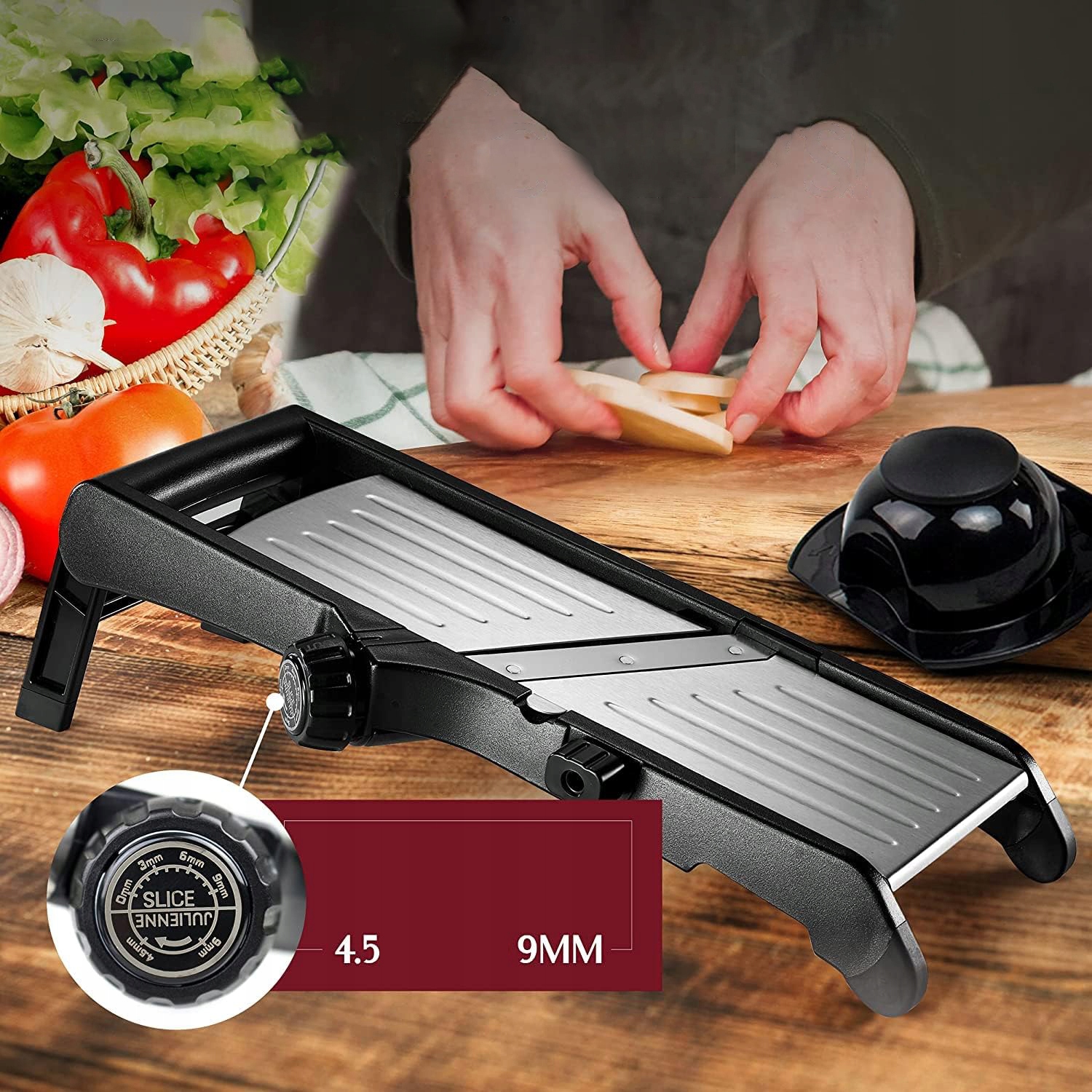 - 🥔 - 【Регульована овочерізка】: Завдяки дизайну ручки V-подібне лезо може можна налаштувати на п'ять різних товщин різання залежно від ваших потреб. Це означає, що овочі можна швидко й без зусиль нарізати рівними скибочками 3 мм, 6 мм і 9 мм, а жульєн – 4,5 мм і 9 мм.