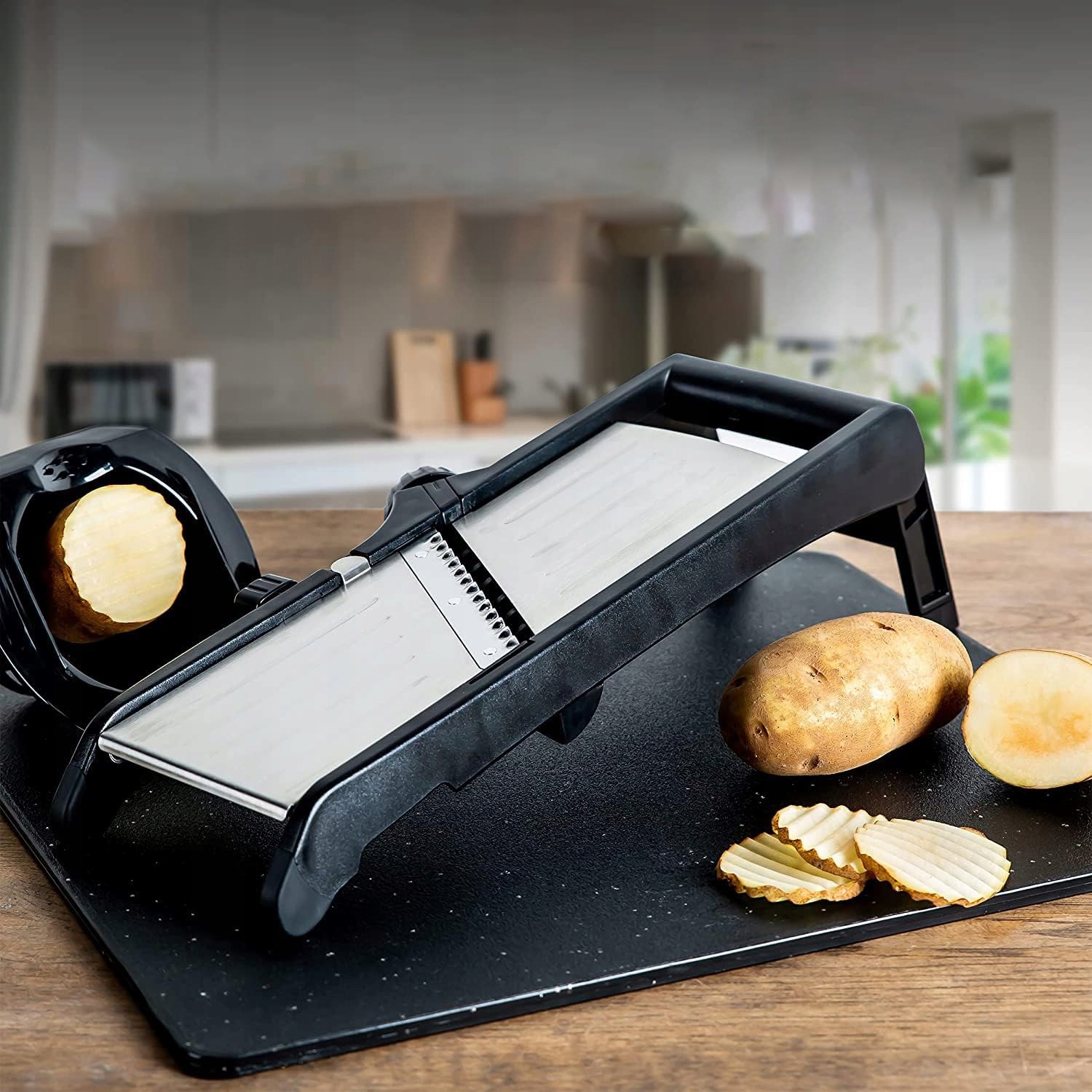 - 🥔 - 【Гарний помічник на кухні】: Завдяки мандоліні овочерізки рівномірне нарізання овочевих нарізок і фруктових батончиків стало простим і швидким завданням. Складні ніжки для зручного зберігання.
