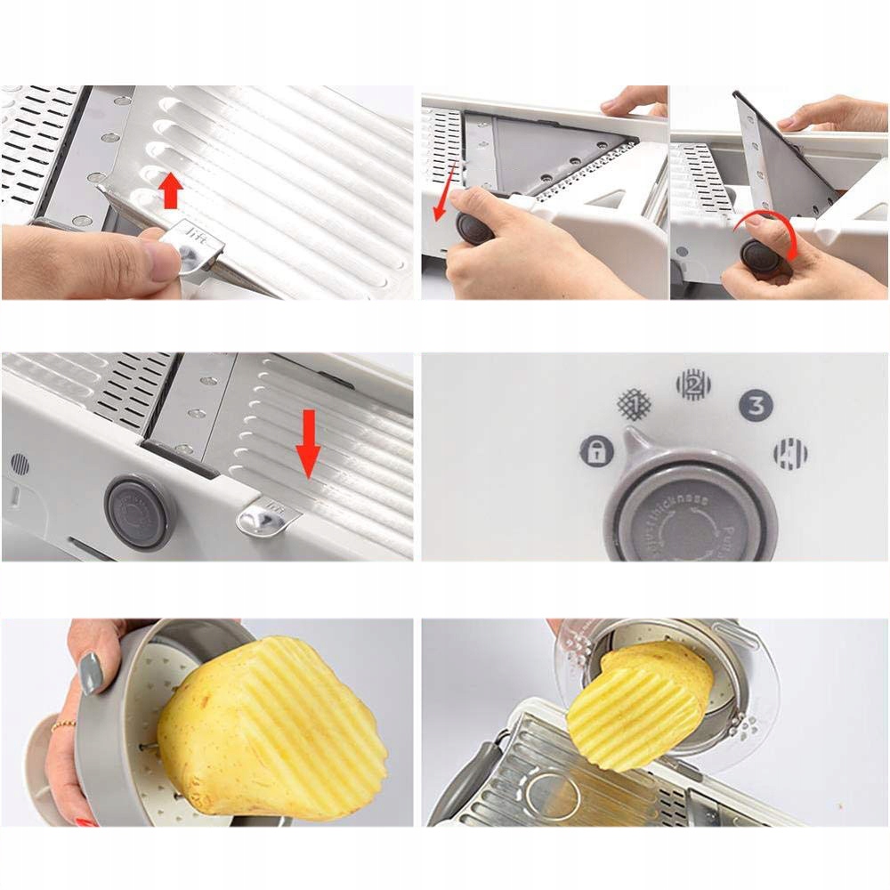 - 🥦- доступні чотири форми (плоскі скибочки, хвилясті скибочки, товсті смужки, тонкі смужки) і чотири варіанти товщини (1 мм/3 мм/6 мм/9 мм), щоб задовольнити ваші різні потреби.