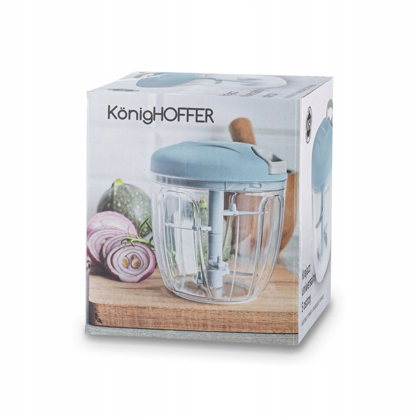 Овочерізка Konighoffer 12,5 х 14 см містка та універсальна. Модель оснащена 5 лезами з нержавіючої сталі. Вони розташовані на різних рівнях, щоб забезпечити максимальну точність подрібнення інгредієнтів. Фреза працює без електрики. Для живлення ножів використовується ручний струнний механізм. Так ви зможете добре контролювати ступінь подрібнення харчових продуктів, закинутих в його прозору ємність. Можна нашаткувати в ньому, наприклад, цибулю і робити це, не боячись, що від нього навернуться сльози. Закрита конструкція дозволить уникнути травм під час використання. Протиковзка основа забезпечує стабільне положення та комфортну роботу. Таким чином ви зможете ефективно приготувати багато страв і навіть приготувати салат.