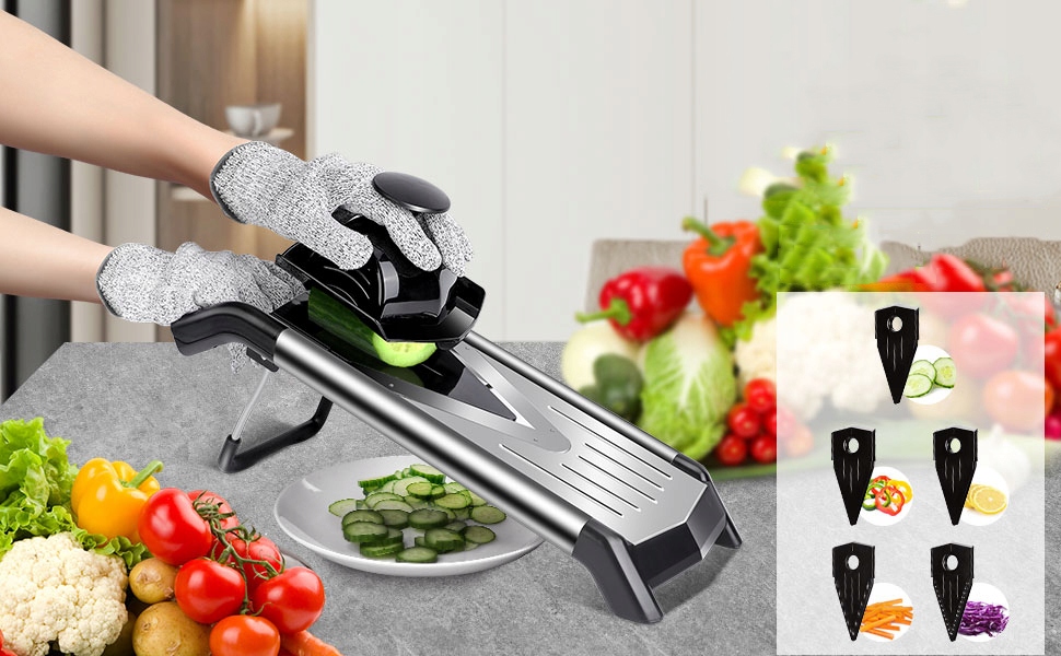 ☑ Досвід, заощадження часу та енергії: Відмінні скорочення з кожним використанням, на 50% менше часу на кухні, менше часу для приготування їжі та більше часу для задоволення! овочі. Він містить шматочок 1,5 мм, шматочок 2,5 мм, шматочок 3,5 мм, 3,5 мм Julienne та 7 мм Жульєн. З відсіком для лопатей для безпечного зберігання лопатей. Очищення овочевого шлюзу легко: після використання просто промийте під проточною водою. Ви можете мити посудомийну машину. Гостре лезо легко перетинає овочі та фрукти. Пристрій складається з плоских і може зберігатися в ящику. Ідеально підходить для різання цибулі, картоплі, моркви, огірків, капусти, буряків, гарбузів та інших.