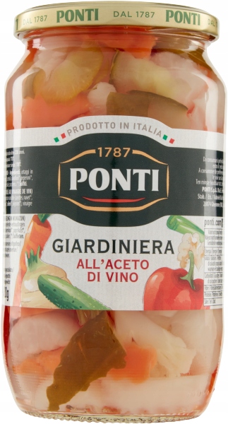 Ponti Giardiniera — класична італійська суміш маринованих овочів. Це ідеальне поєднання свіжих і хрустких овочів, ретельно відібраних і підготовлених. Суміш складається з різних видів овочів, таких як перець, морква, цибуля, селера, огірок і артишоки, які надають їй різноманітних смаків і текстур.