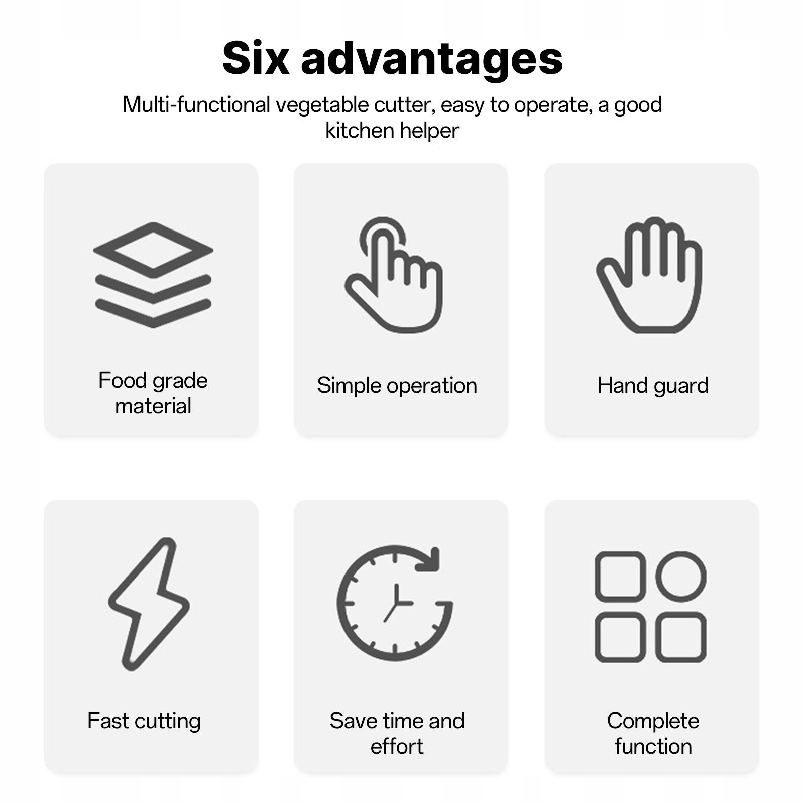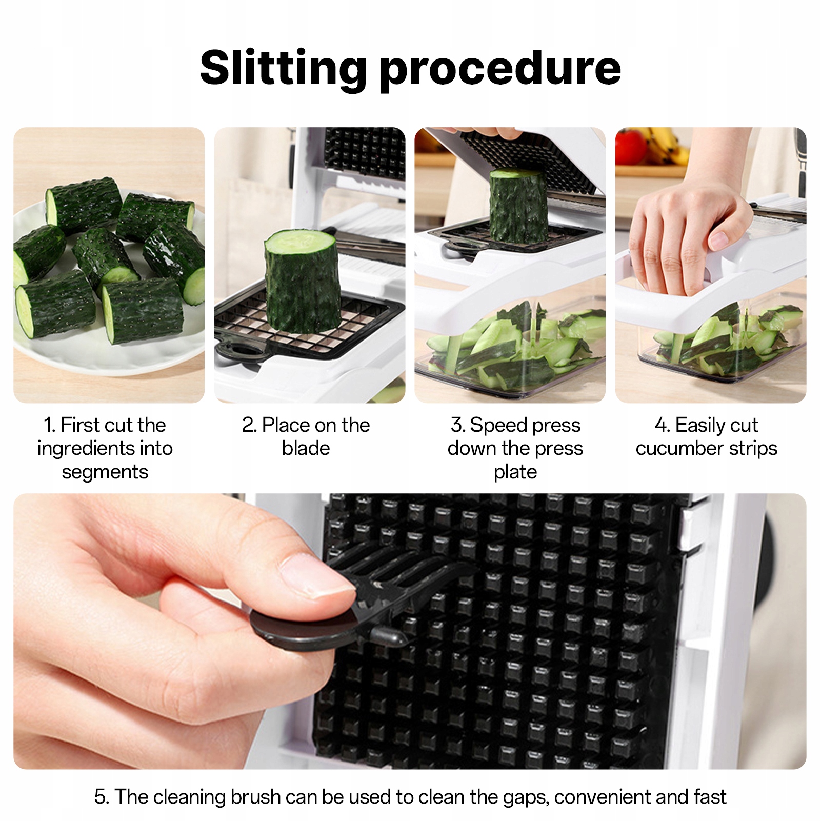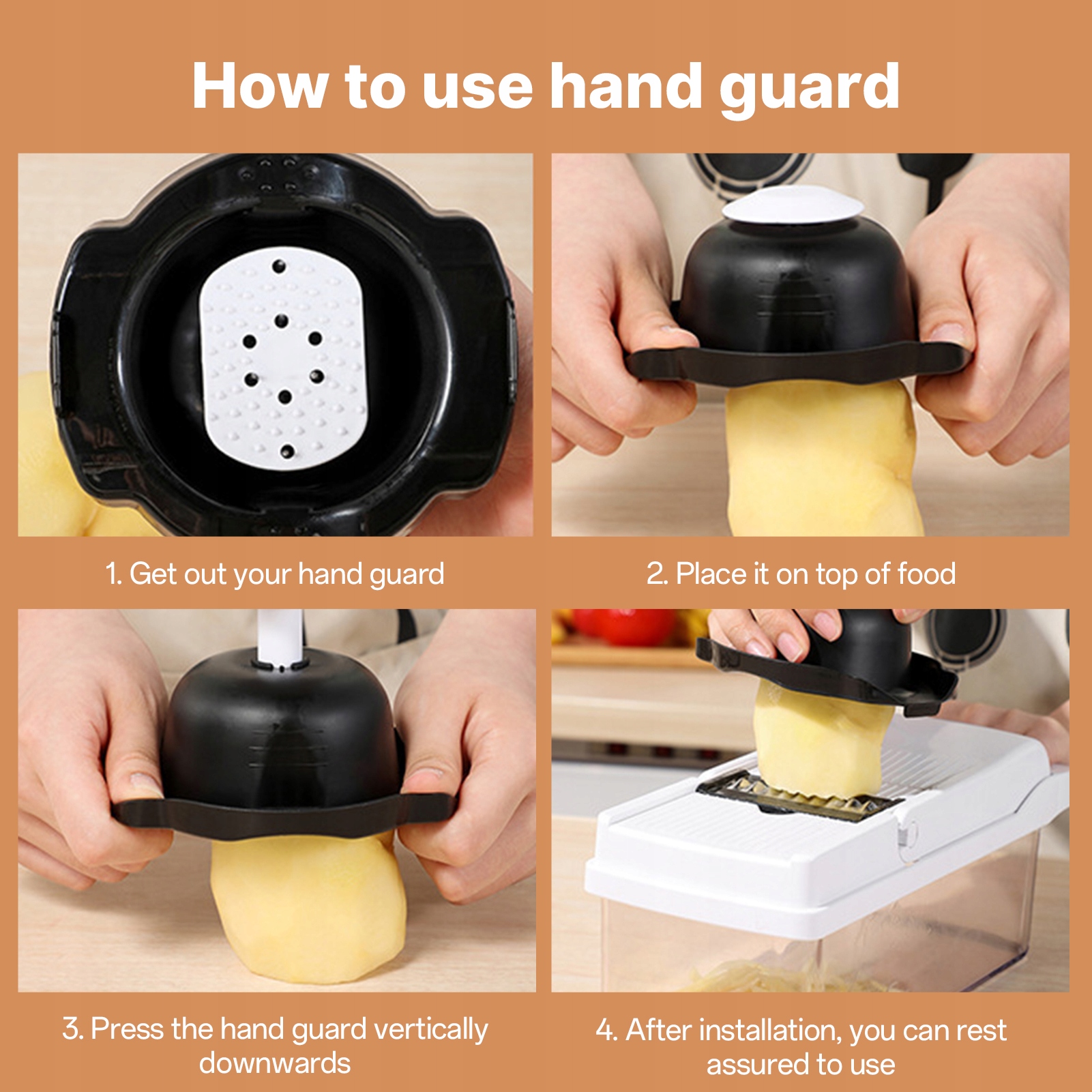 4. Захист безпеки: повністю загорнутий дизайн для захисту рук, різання овочів не зашкодить вашим рукам. Оснащений захистом для рук, тож вам не потрібно безпосередньо торкатися подразнювальних фруктів і овочів.