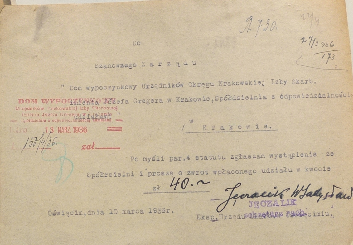 Заява члена Кооперативу про повернення сплачених паїв. Завданням проекту було будівництво будинку відпочинку для чиновників Податкової палати Краківського округу. Датовано березнем 1936 р. Під текстом печатка та підпис секретаря бухгалтерії Податкової служби в Освенцімі. Формат 21x15 см, гарний стан [ OŚWIĘCIM ] [ СКАРБНИЦЯ ] [ Друга Польська Республіка ] [ КООПЕРАТИВ ] 22321
