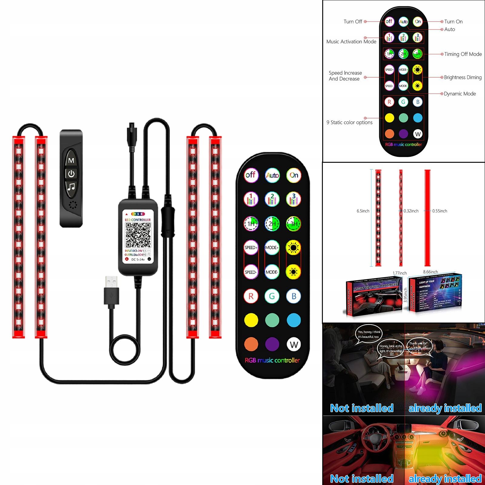 Oświetlenie wnętrza samochodu RGB 2 linie Design Wielokolorowa bezprzewodowa sekcja USB