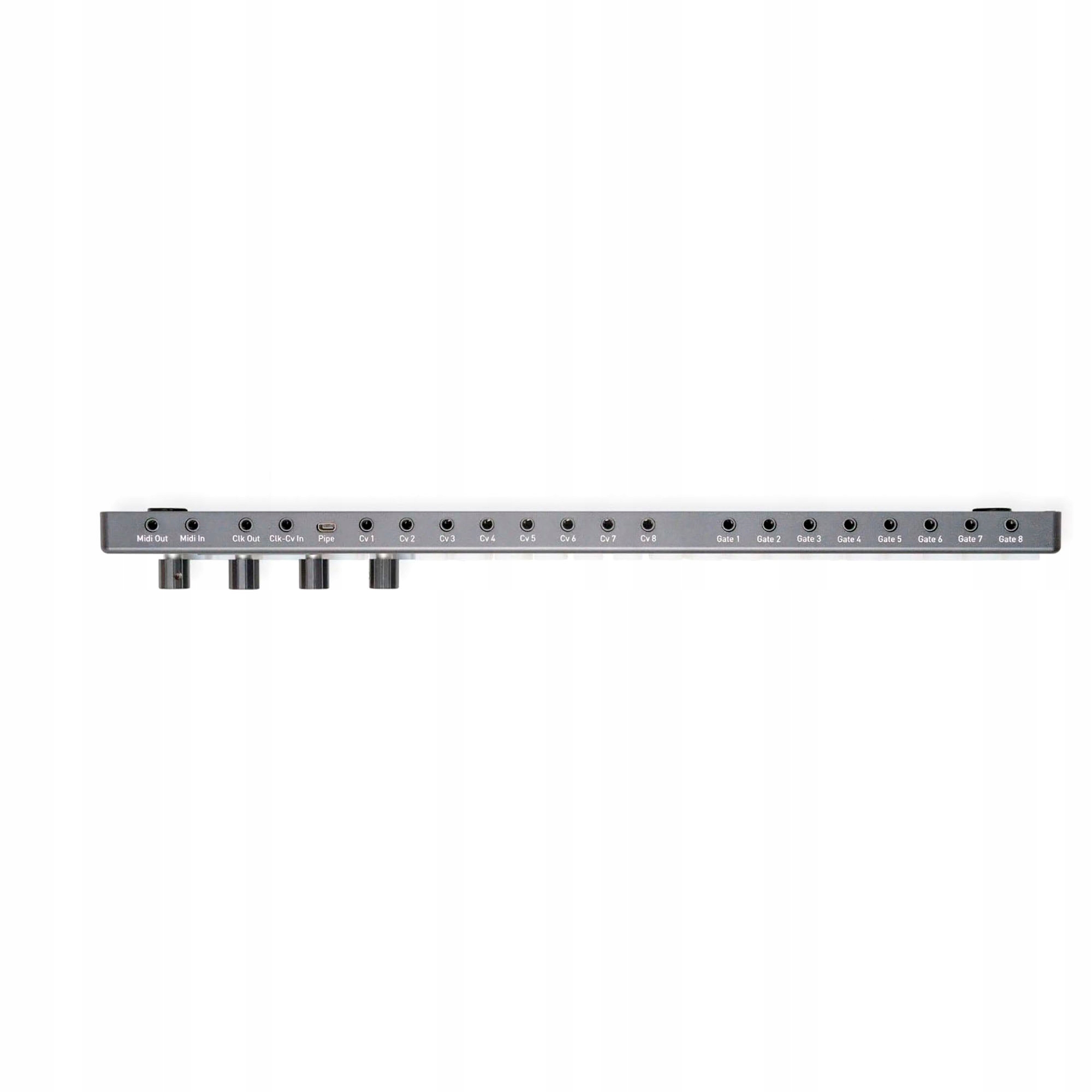 Усім, кому потрібен більше одного MIDI-виходу, рекомендується використовувати SPLIT Box, який доповнює One двома додатковими MIDI-виходами (загалом 3x MIDI Out) і Thru-виходом. Вхід MIDI можна використовувати для підключення головної клавіатури або для синхронізації One як Slave з іншим пристроєм. Інструмент із синхронізацією Din (наприклад, TB-303, TR-606) або секвенсор Eurorack через розгалужувач TR-TR можна підключити до входів і виходів годинника за допомогою адаптера DIN. Pipe — це з’єднання для однойменного модуля Eurorack, яке мінімізує безлад кабелю на виходах CV/Gate za One і забезпечує більший порядок у модульній системі. Вісім виходів CV і Gate — все, що вам потрібно: 8x Velocity і Gat