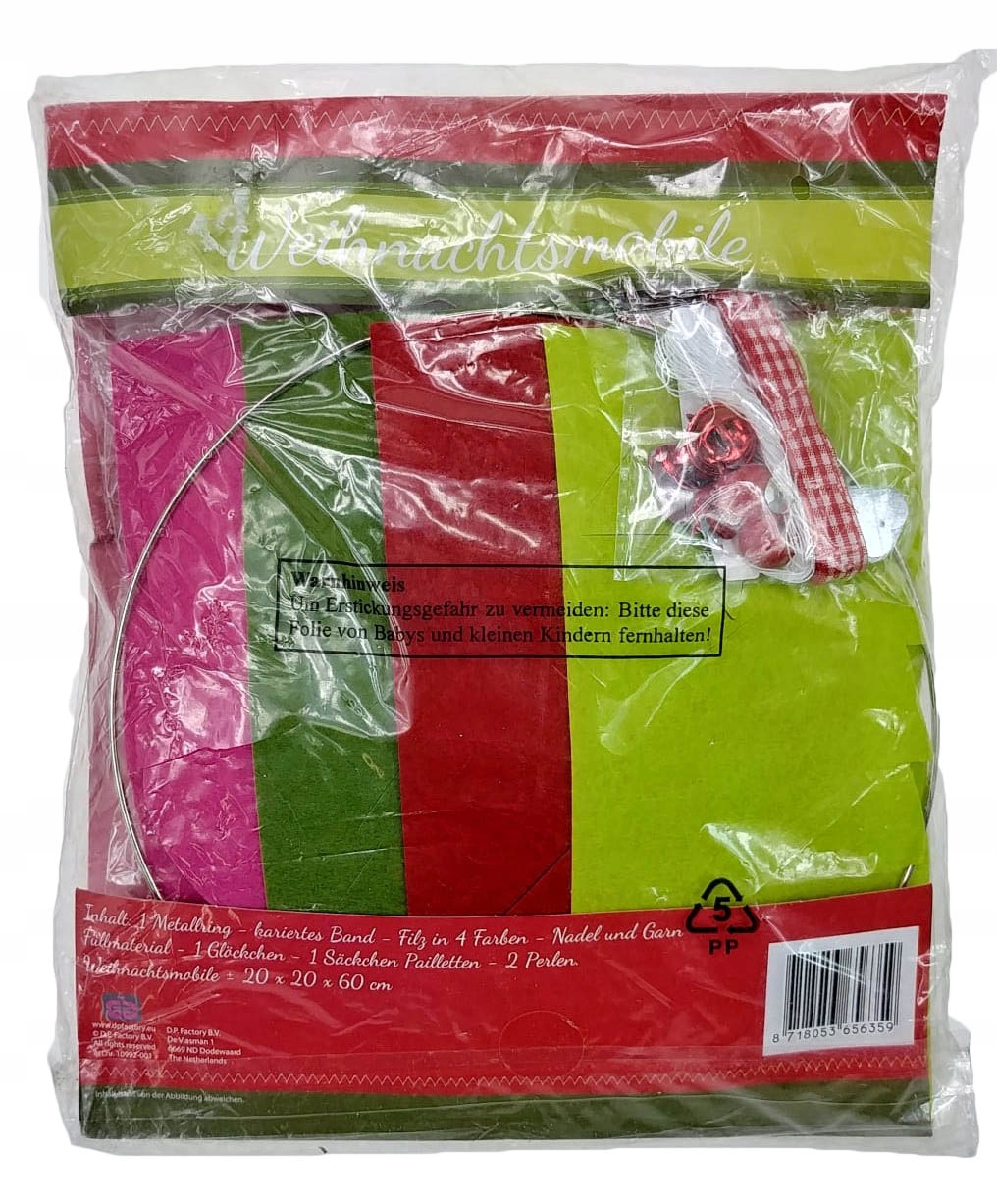 - до набору входить: металеве кільце діаметром 20 см, картаті декоративні стрічки, фетрові шаблони 4 кольорів, голка та пряжа, дзвіночок, кульки, наповнювач для декорацій,