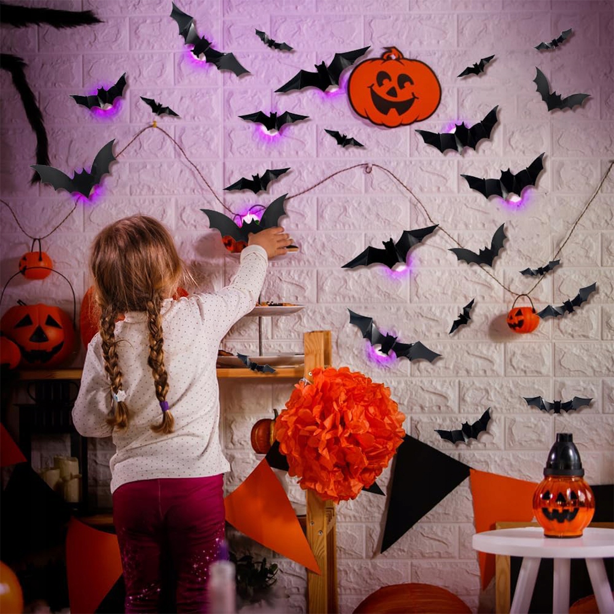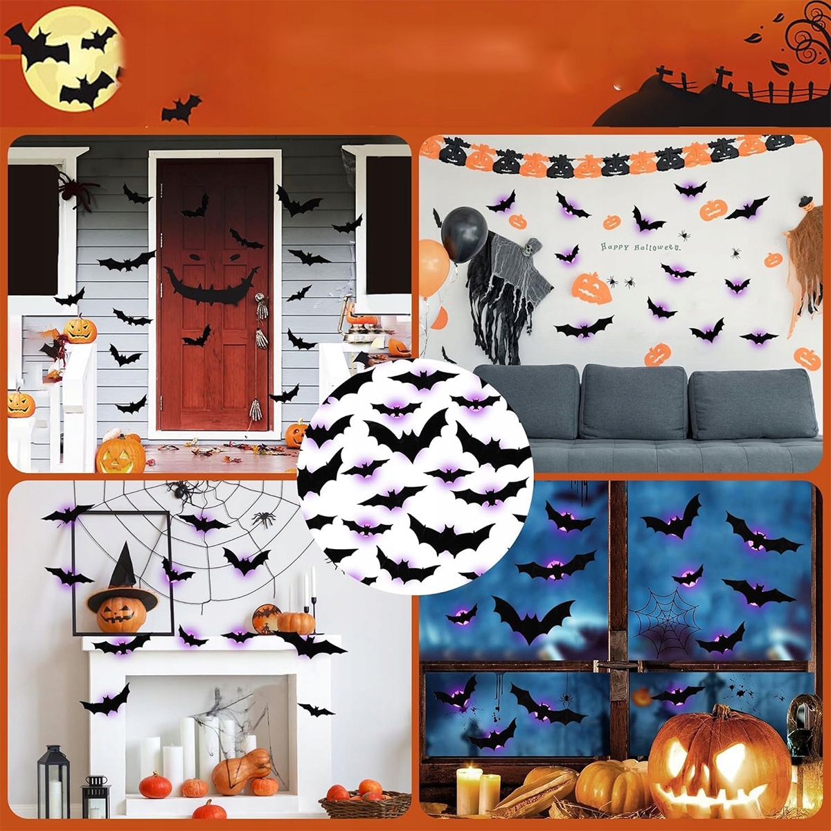 Набір світлодіодних світильників у формі форми кажана на Хеллоуїн 24 настінні наклейки у формі кажана, 24 світлодіодних світильників (8 миготливих фіолетових ламп + 16 миготливих червоних та синіх ламп) та 24 подвійні наклейки. Під час цього очікуваного Хеллоуїна достатня кількість світильників створює сильну, святкову атмосферу.