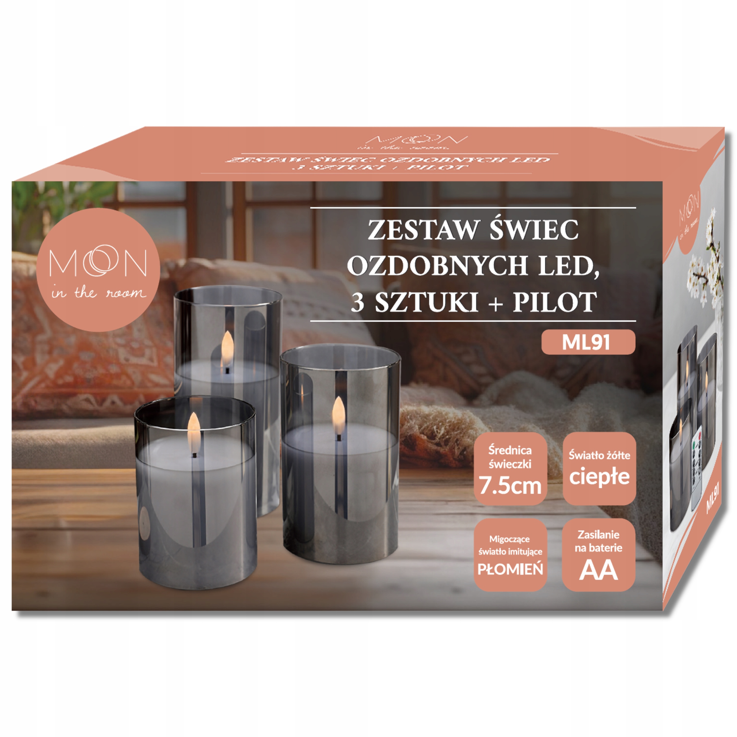 Ozdobne świece LED szkło dymione, zestaw 3 sztuki+ pilot