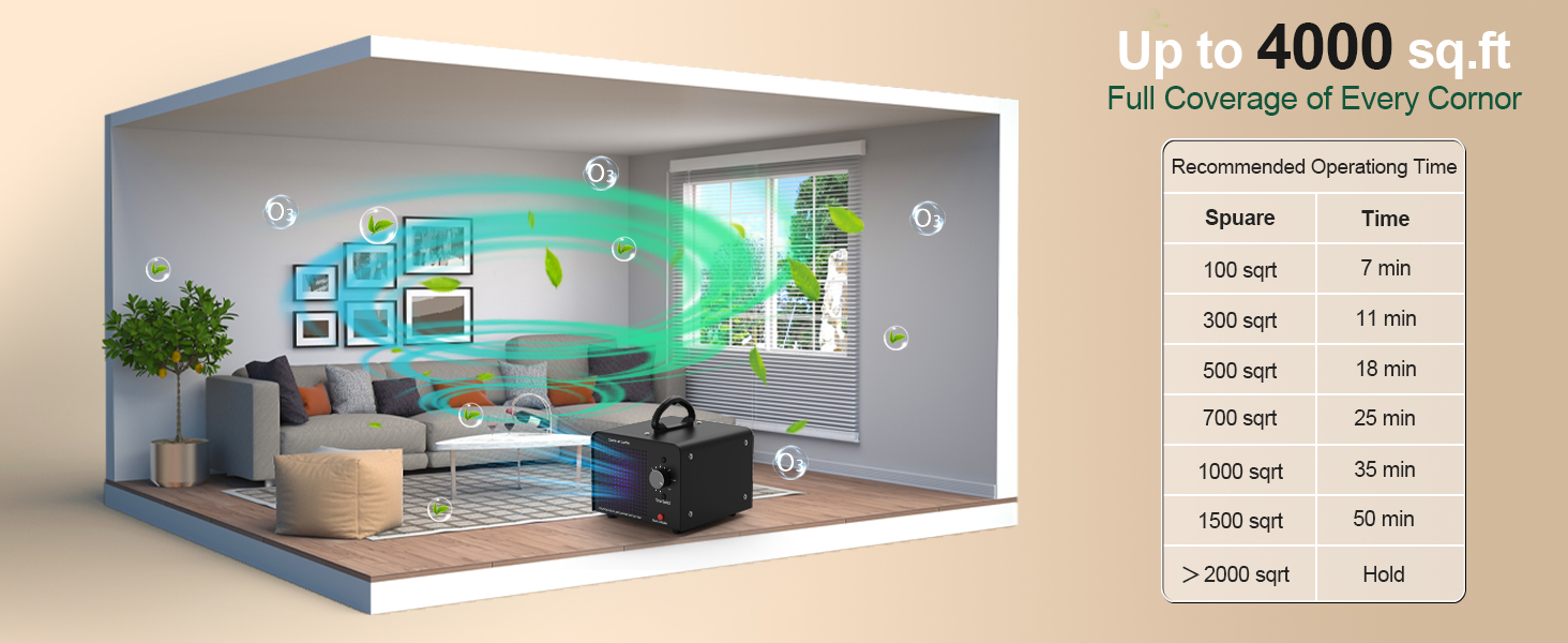 ✅ Більше потужності - Генератор має максимальну вихідну потужність 60000 мг/год, що підходить для простору 300㎡. Виробництво озону більш стабільне, ефективність на 50% вища, ніж у звичайного озонатора.