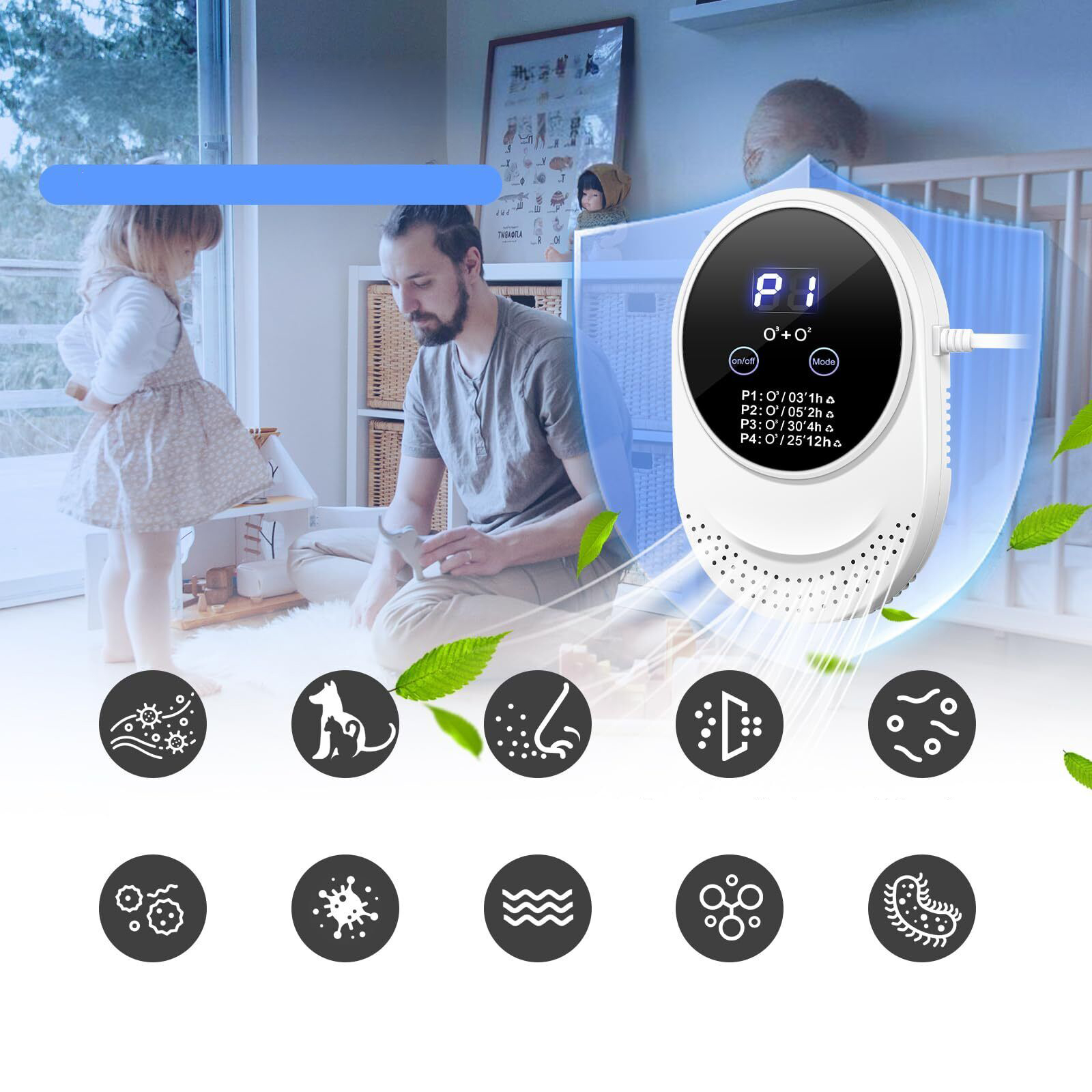 Швидка дезодоризація: Активний кисень з ємністю 150 мг/год очищувача повітря забезпечує професійну швидку дезодоризацію. Він може видалити специфічний запах ванних кімнат, специфічний запах домашніх тварин, кухонні пари, запахи диму, дезінфекцію та прикрасу нового будинку, видалення формальдегіду та очищення повітря можна вирішити для захисту життєвого середовища.