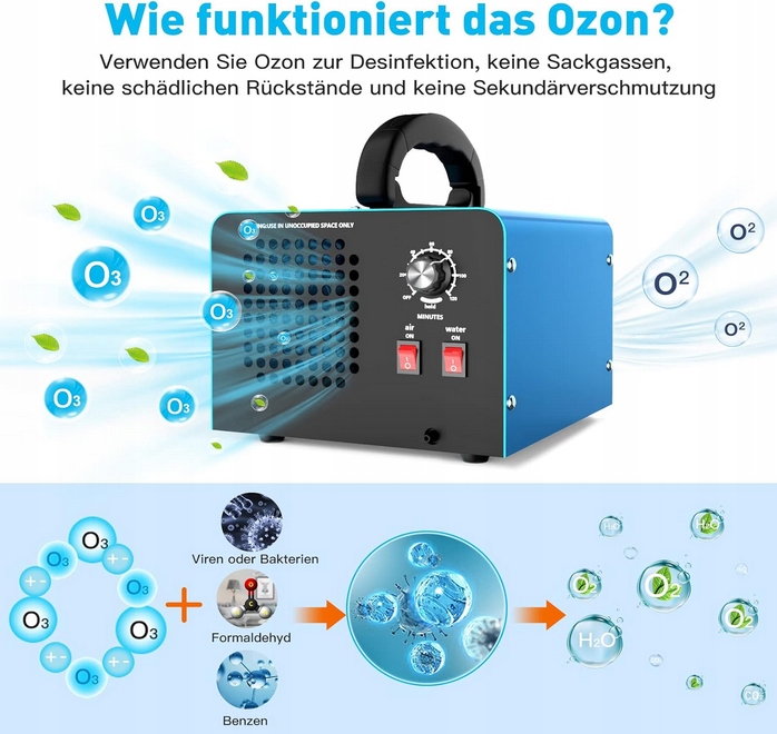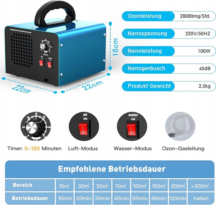 - Енергетика - оносійне онатор та портативне - очищення повітря з озоном є екологічно чистим (не потребує фільтра), потужність становить лише 100 Вт. Скромний розмір 20 х 18 х 16 см і портативна ручка носіння полегшує встановлення очищувача озону в будь -якому місці.