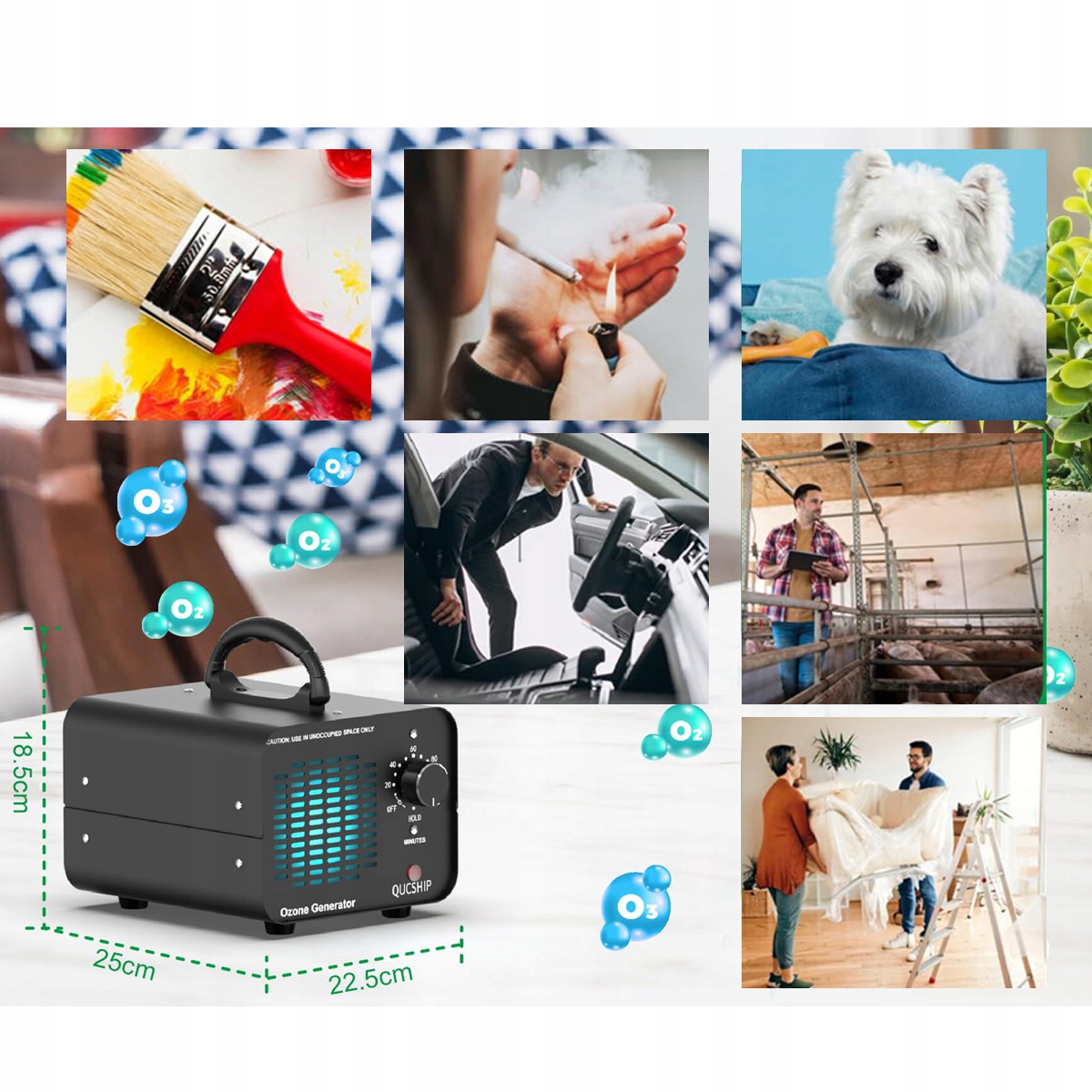 Сучасний промисловий озон може виробляти 15 000 мг озону на годину. Швидко видаляє неприємні запахи. Ефективно дезодулює та дезінфікує приміщення, захищаючи їх від шкідників та летких органічних сполук (ЛЗО), таких як формальдегід. Ідеально підходить для створення чистого та комфортного середовища в будинках, спальнях, офісах, готелях, ресторанах, автомобілях тощо