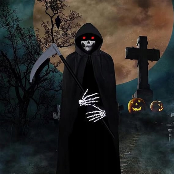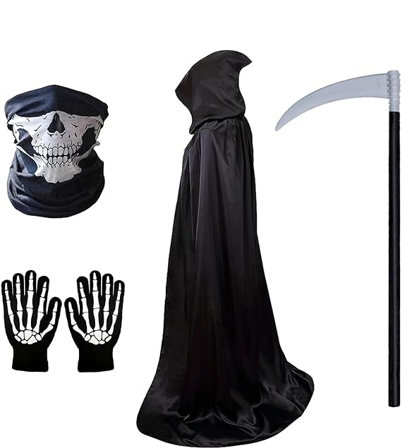 ✅ У наборі набору - сукня, накидка з капюшоном, металевий ланцюг, пара чорних рукавичок, маска для обличчя та іграшка в серпні.