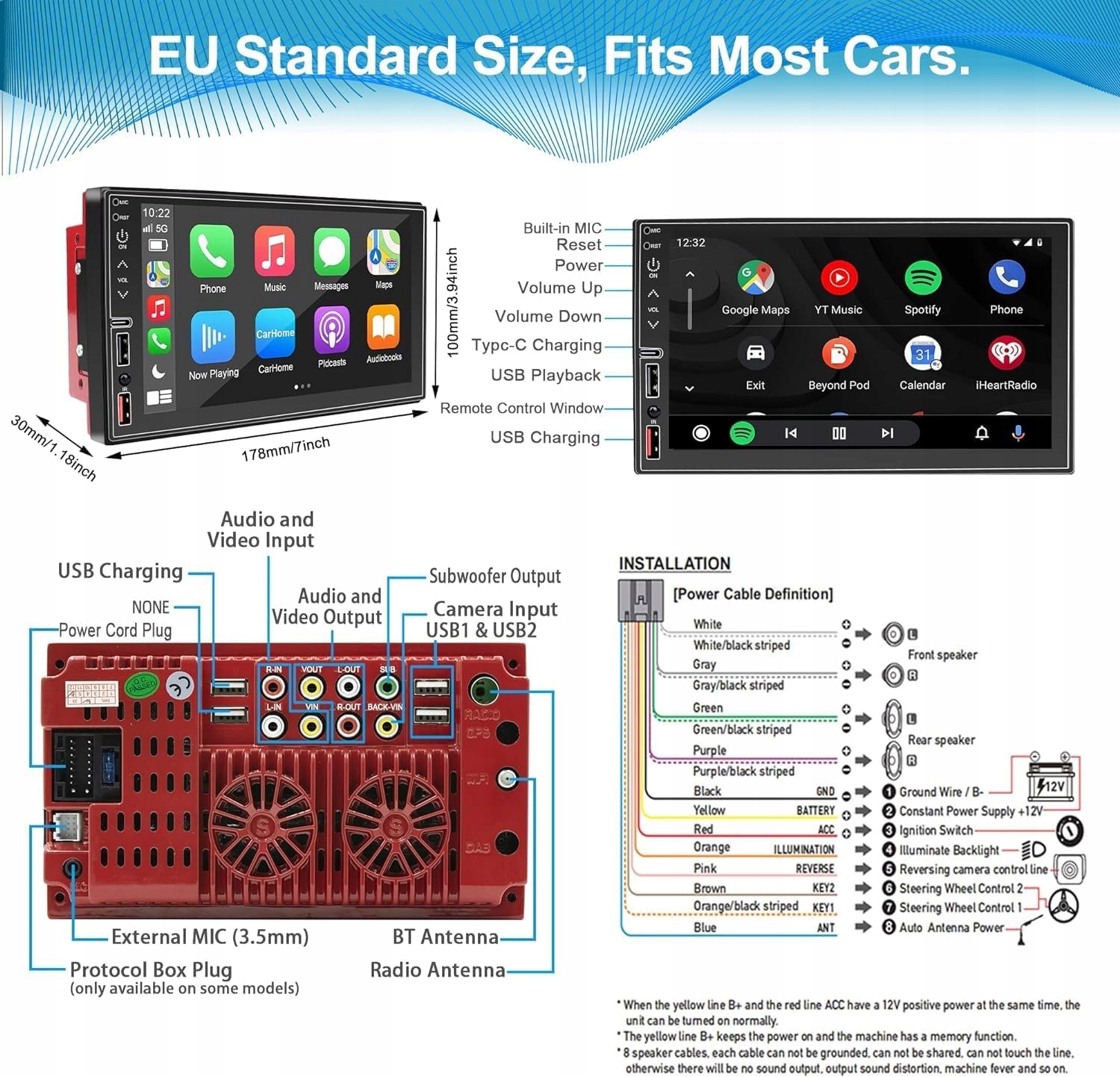 - Бездротовий Carplay та Android Auto】: Бездротовий підключення Bluetooth Wi-Fi для iOS Carplay та Android Auto або використовувати оригінальний USB-кабель. Просто використовуйте Carplay або Android Auto (телефон з Android вимагає завантаження з Android Auto "). Активуйте голосовий помічник" siri "або" Assistant Google ", щоб безпечно здійснювати дзвінки під час руху, слухати музику, надсилати та отримувати повідомлення, використовувати навігацію та багато інших. Завдяки автомобільному радіо Eslclo ви отримаєте професійний та ефективний стиль руху. Всі Iphone та Android. Контроль, обробка функції управління кермом (за допомогою SWC), відтворення через порт USB/Type C, швидка зарядка, підключення до Aux-In, 7-кольорові світлодіодні кнопки, музичний програвач, відеоплеєр тощо. ESLCLO має професійну технічну команду та відмінне обслуговування клієнтів.