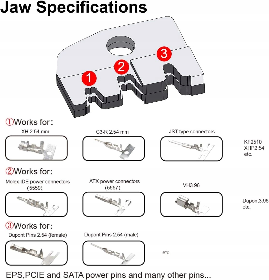 - Діапазон обтискних кліщів Dupont - кліщі Preciva Dupont призначені для неізольованих відкритих роз’ємів (ширина штекера 2,54 + 3,96 мм і ємність 0,1–1,0 мм²). AWG 26-18, ідеально підходить для підключень ATX, EPS, PCIE та SATA.